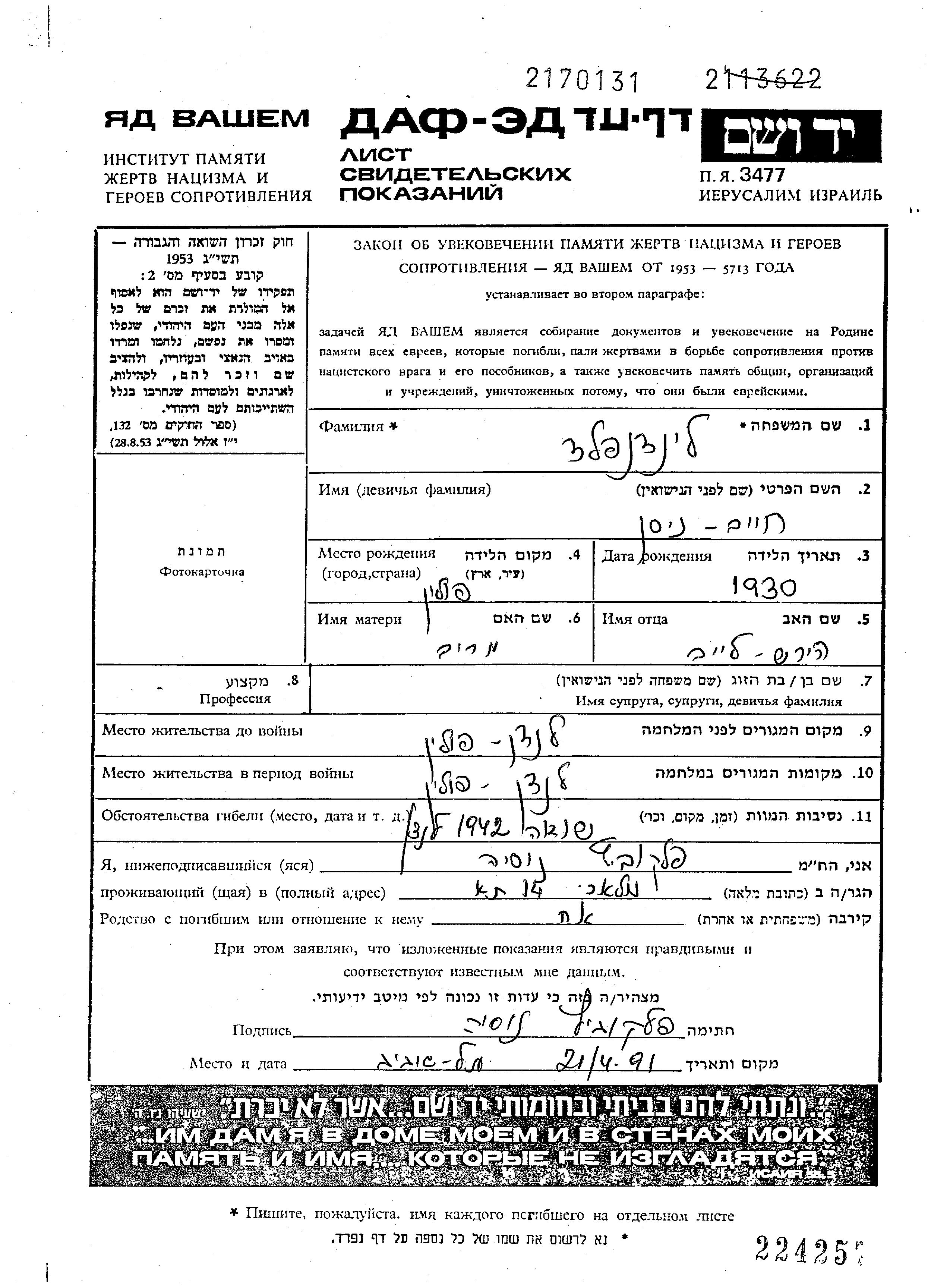 Natan Khaim Nisan wurde in der Schoah ermordet. Todesort: Lanczyn, Polen im Jahr 1942.