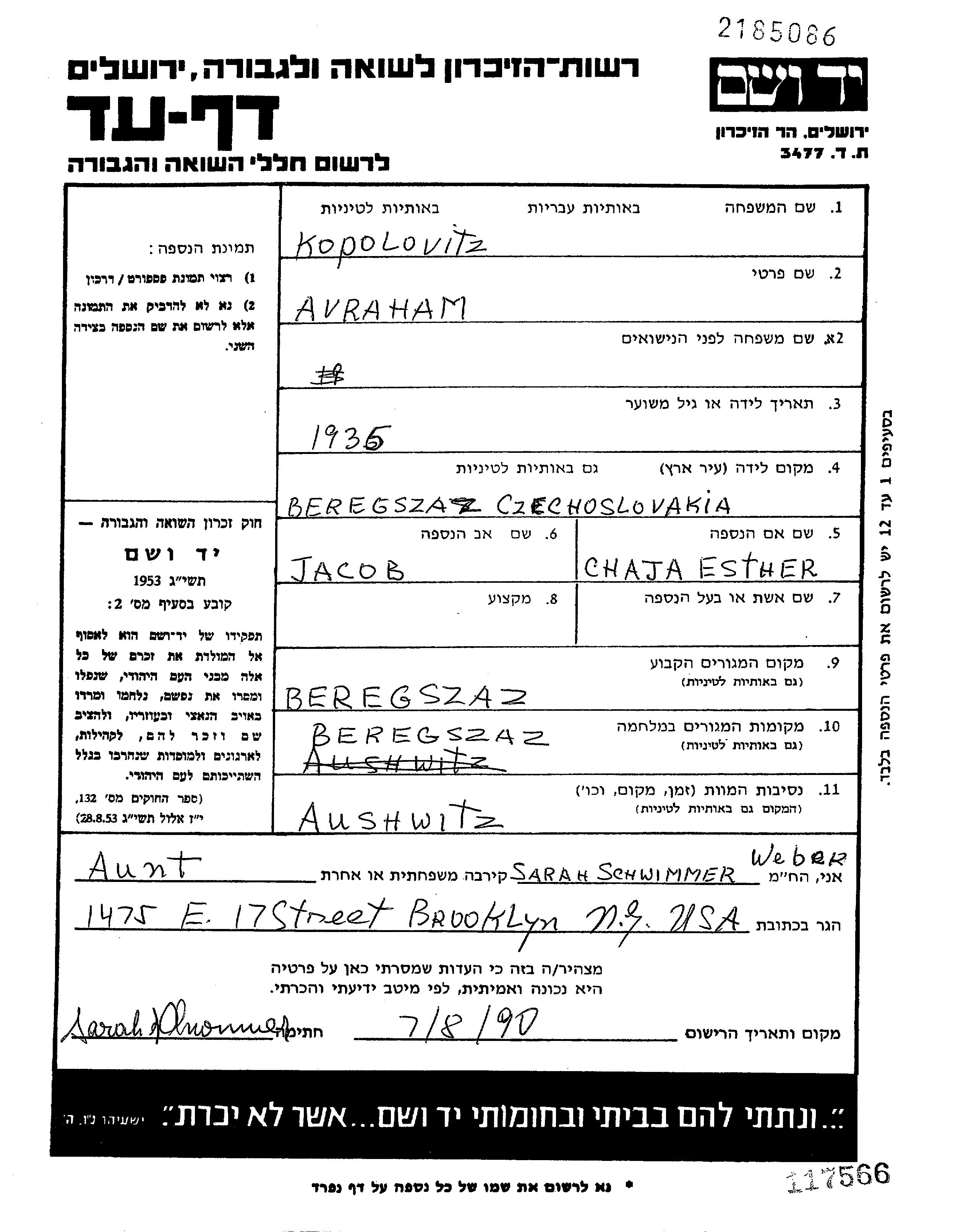 Kopolovitz | Avraham | 1935 | Beregszasz, Tschechoslowakei | Gedenkblatt |