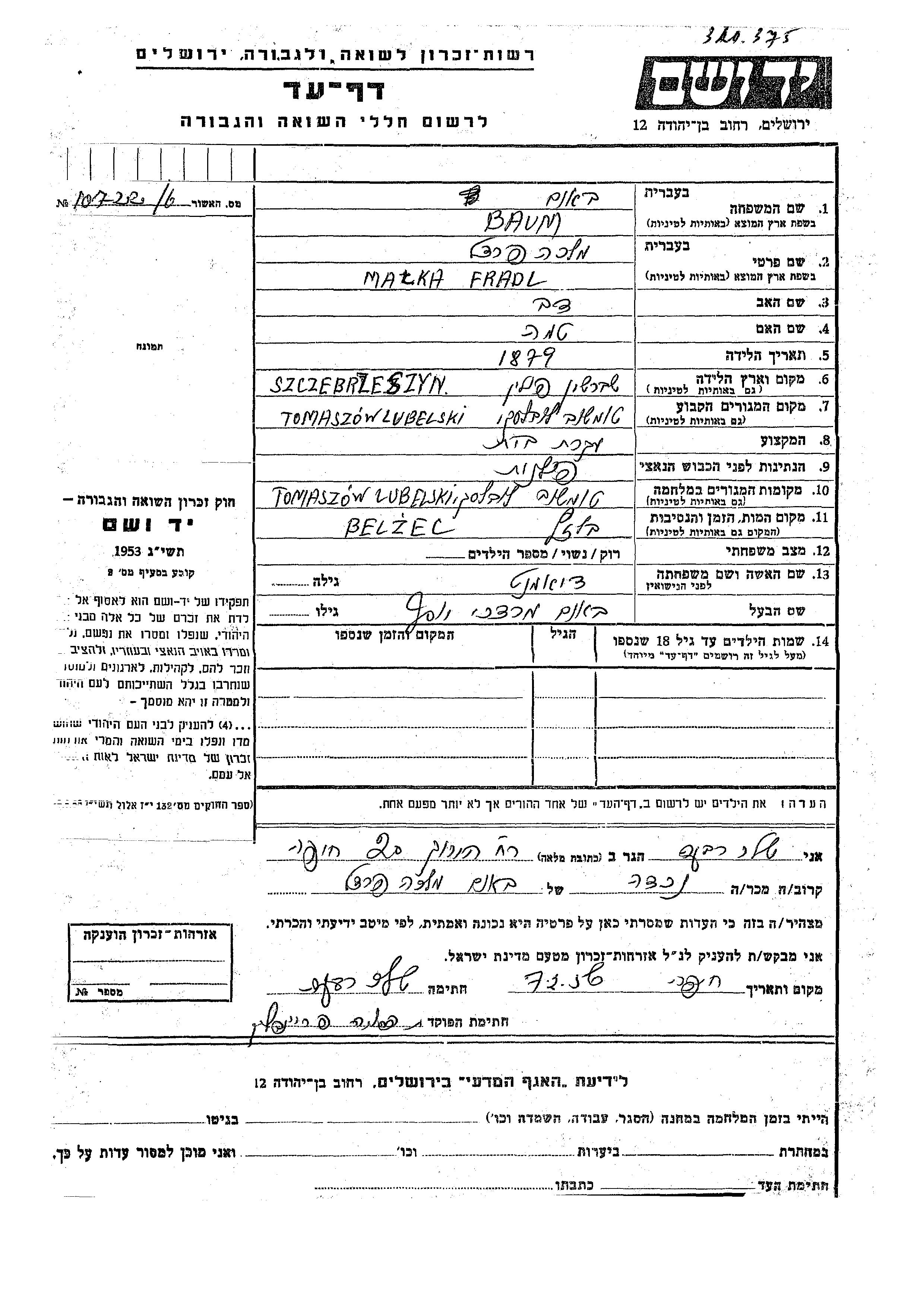 Fradl Malka Baum, geb. Diamant wurde im Jahr 1879 in Szczebrzeszyn, Polen geboren. Sie war die Tochter von Dov und Tema. Sie war Hausfrau und mit Mordekhai Yosef Verheiratet. Vor dem Zweiten Weltkrieg lebte sie in Tomaszow Lubelski, Polen. Während des Krieges war sie in Tomaszow Lubelski, Polen.