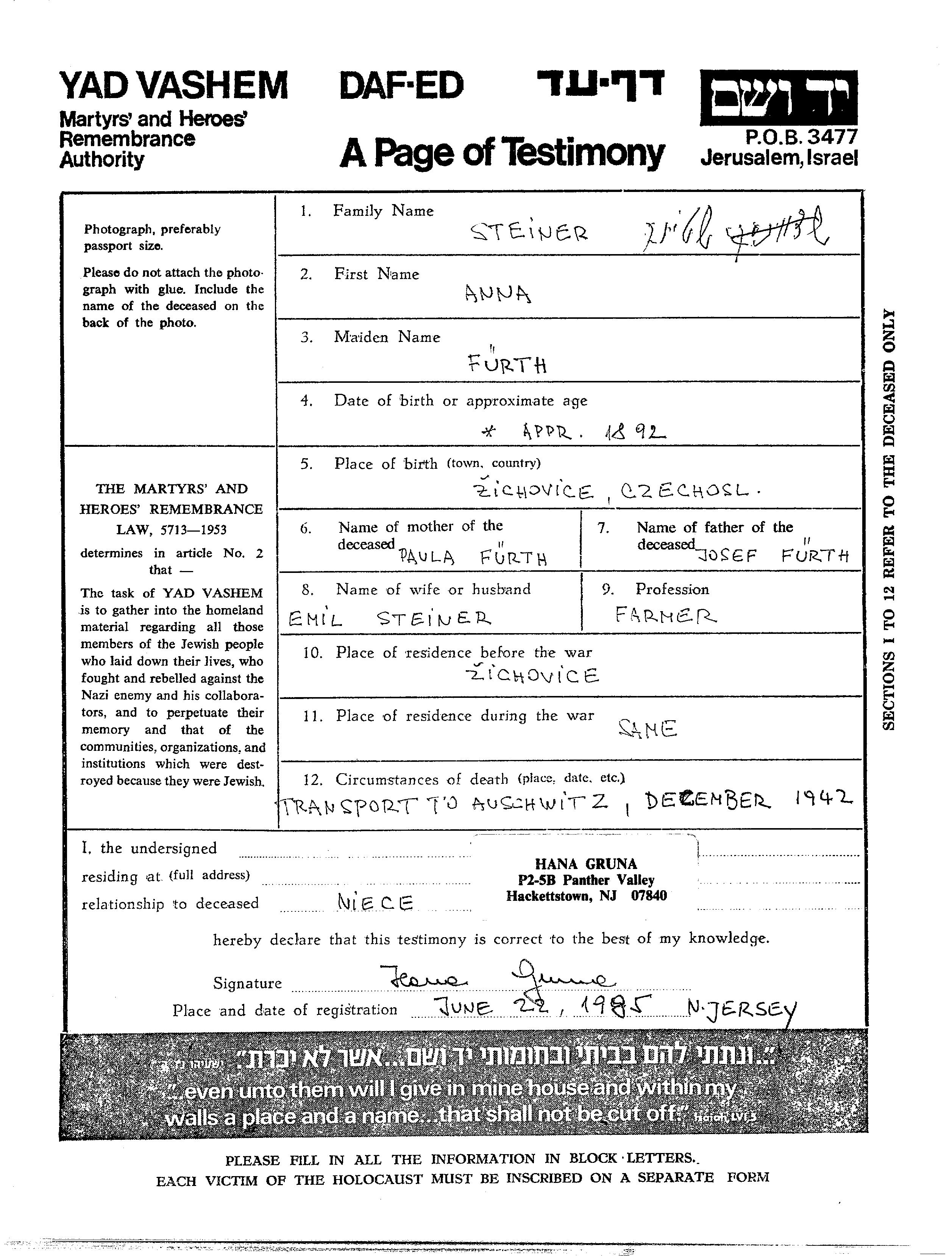 Anna Steiner, geb. Fürth wurde im Jahr 1892 in Zichovice, Tschechoslowakei geboren. Sie war Hausfrau. Vor dem Zweiten Weltkrieg lebte sie in Zichovice, Tschechoslowakei.