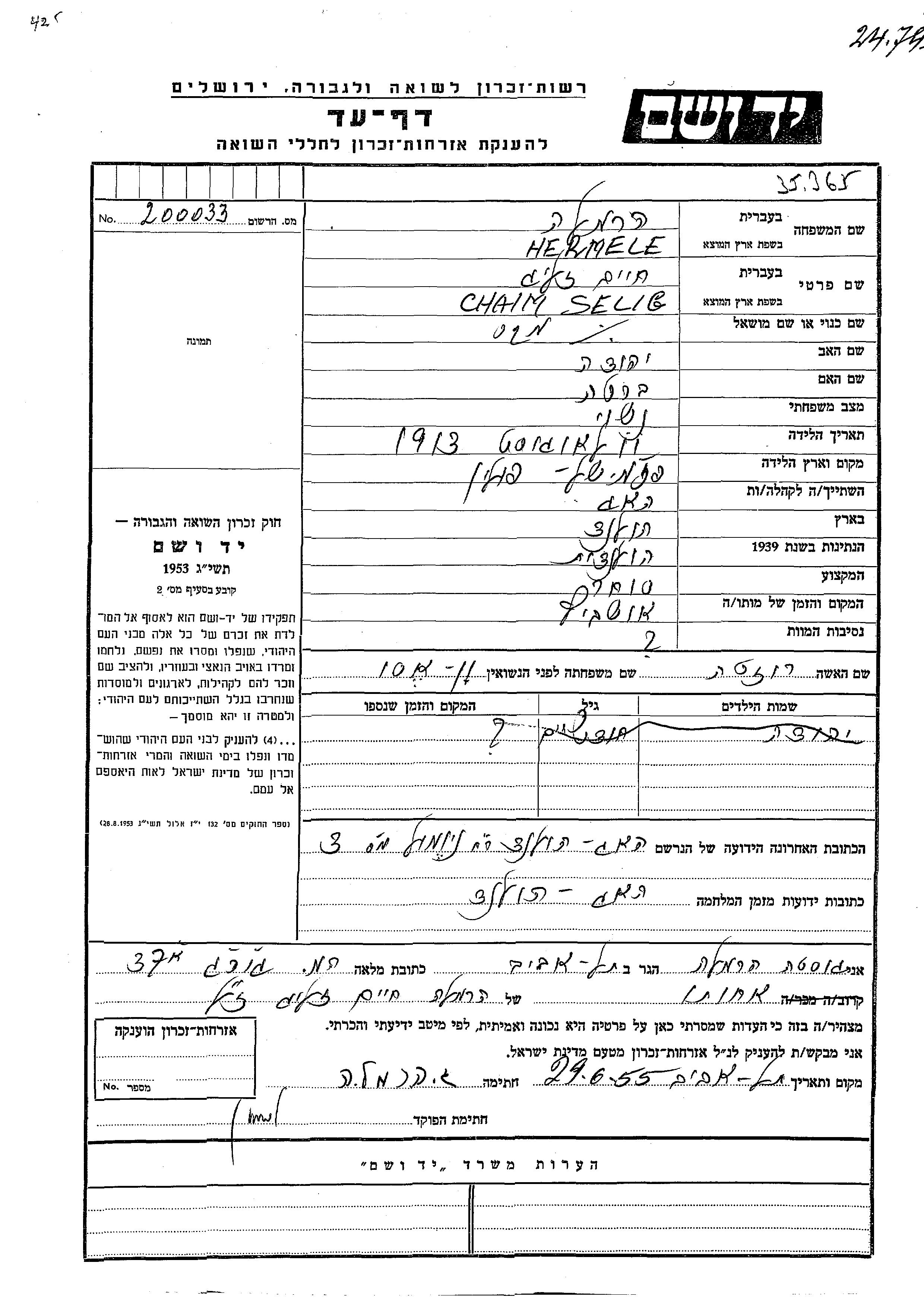 Khaim Zelig Max Hermele wurde im Jahr 1913 in Przemysl, Polen geboren. Er war Kaufmann/-frau. Vor dem Zweiten Weltkrieg lebte er in S Gravenhage, Niederlande.