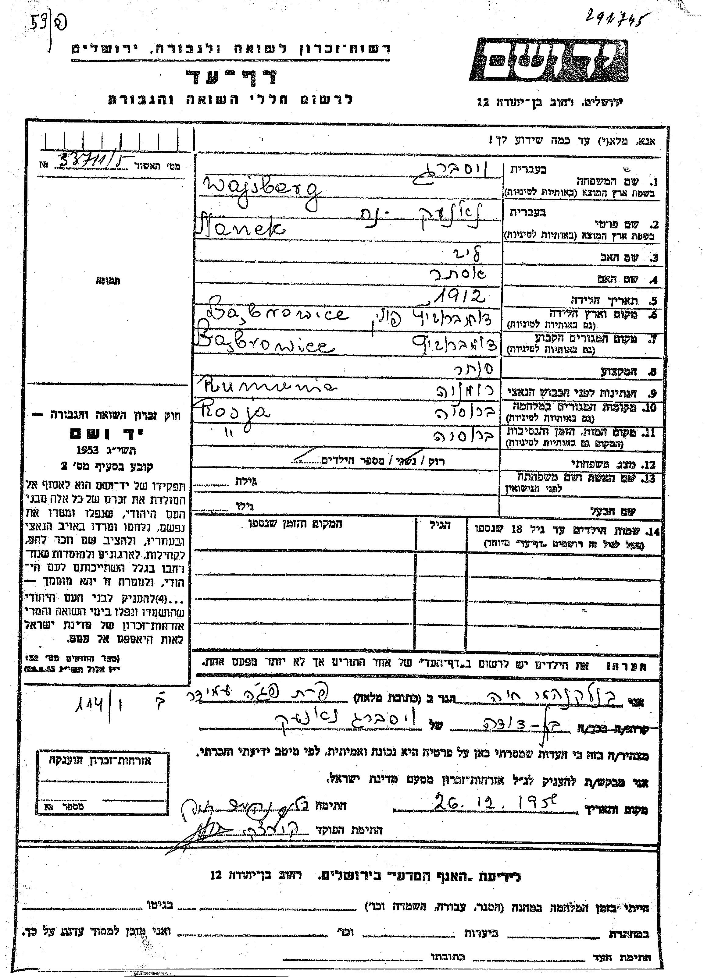Nanek Noakh Wajsberg wurde im Jahr 1912 in Dumbrăviţa, Rumänien geboren. Er war der Sohn von Leib und Ester. Er war Kaufmann/-frau und Ledig. Vor dem Zweiten Weltkrieg lebte er in Dumbrăviţa, Rumänien. Während des Krieges war er in Russland (UdSSR).