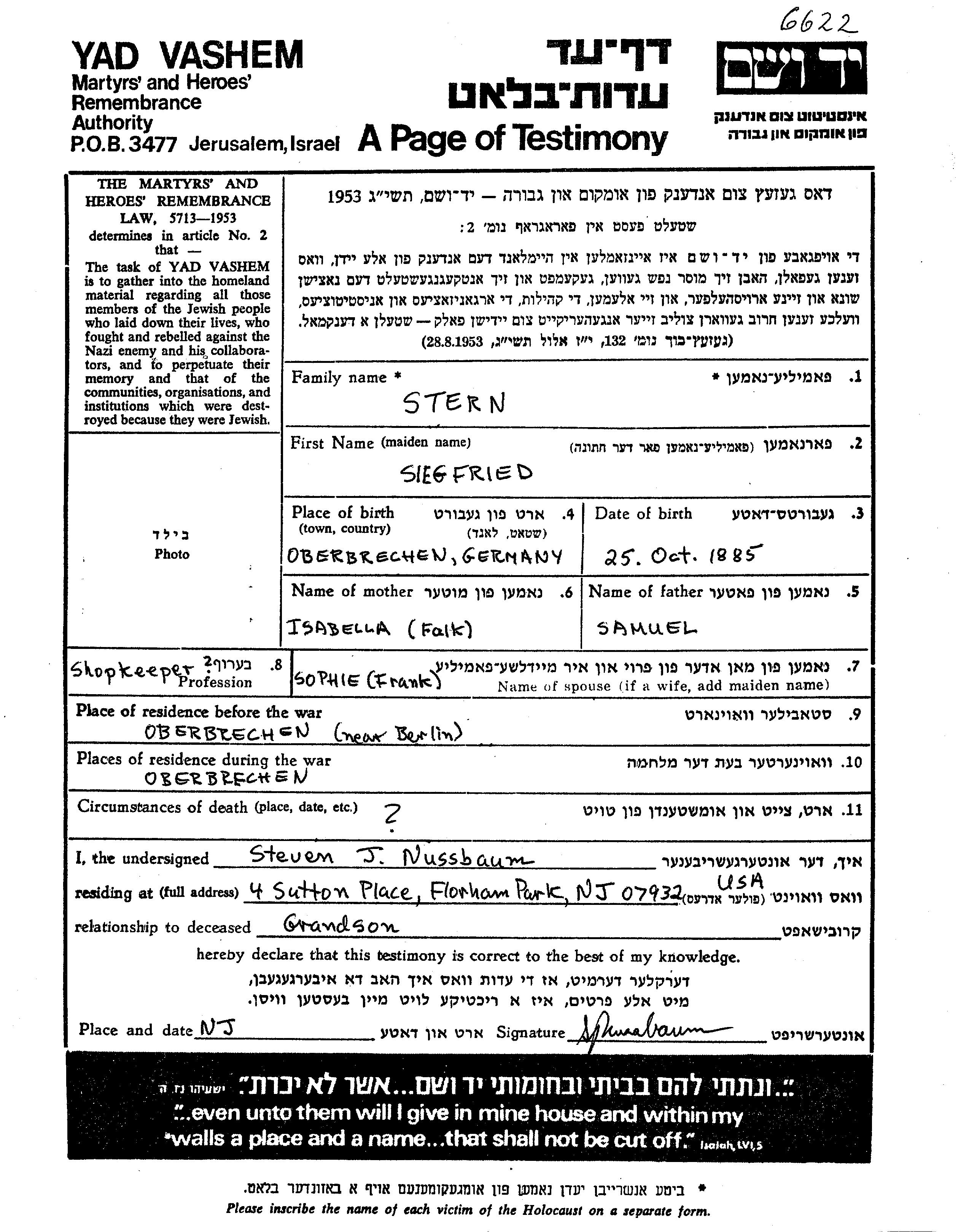 Shtern Zigfrid 1879 Oberbrechen, Deutsches Reich Gedenkblatt