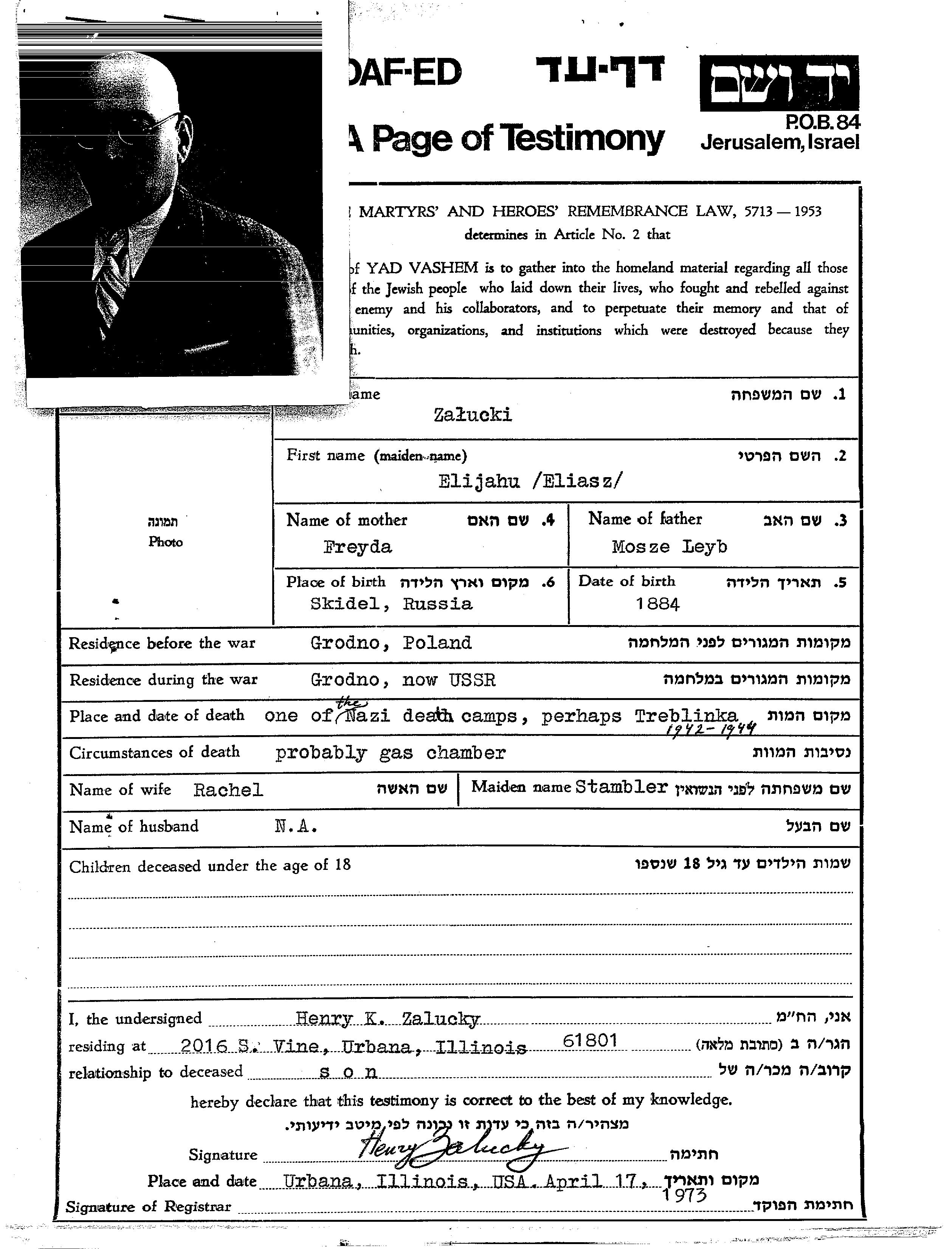 Zalucki Elijahu 1884 Grodno, Polen Gedenkblatt