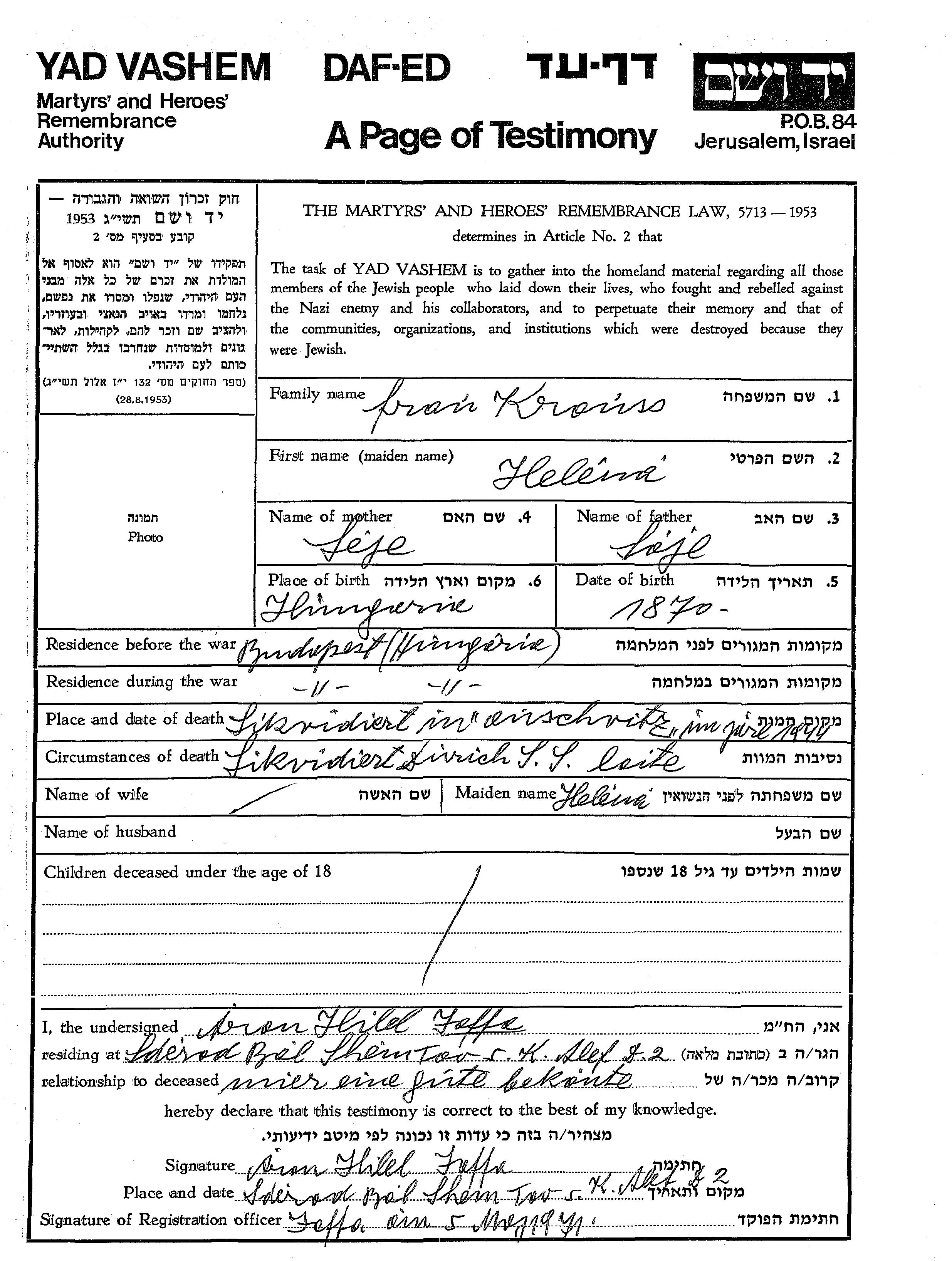 Helena wurde in der Schoah ermordet. Todesort: Auschwitz, Polen im Jahr 06/1944.