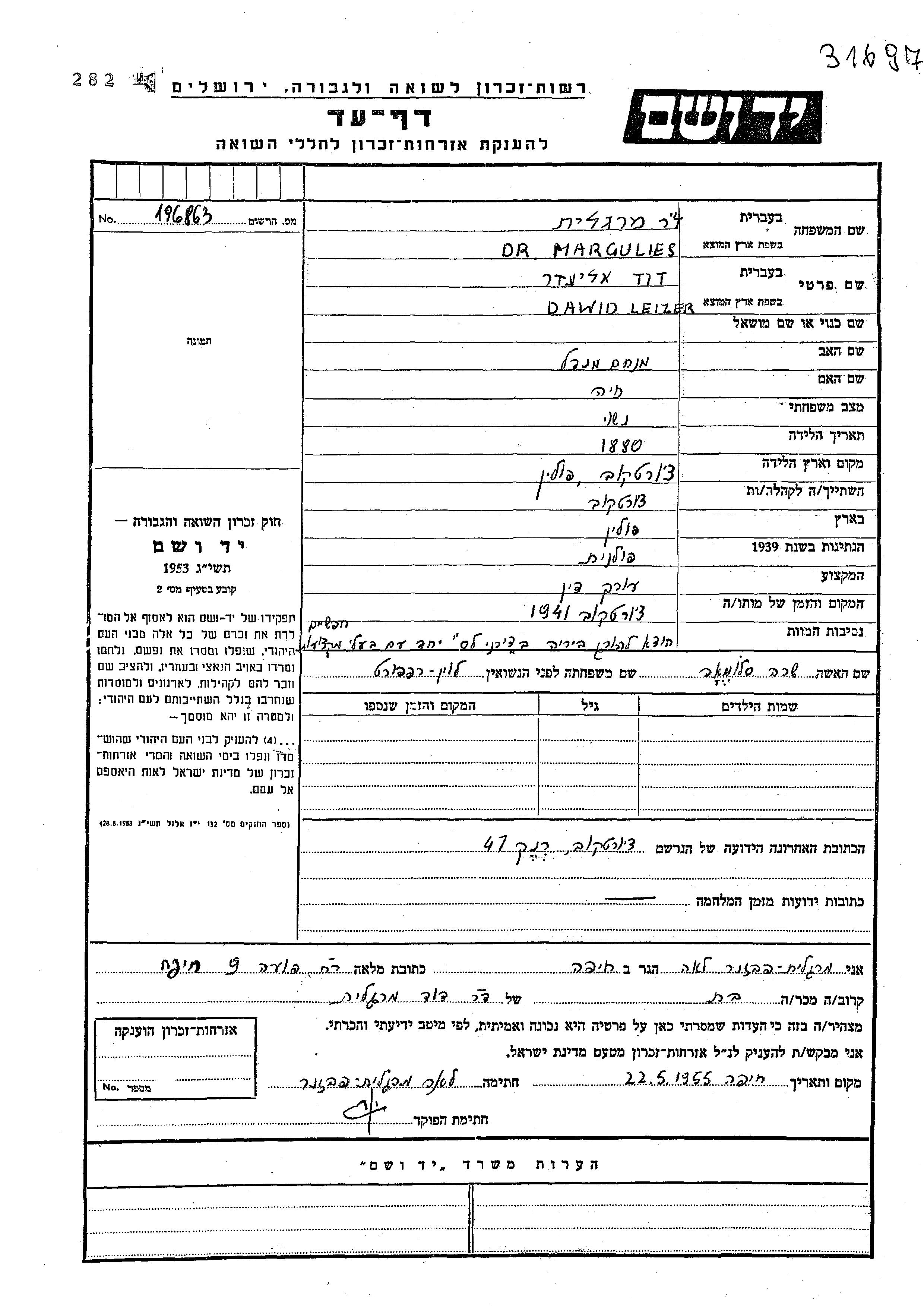 Margulies | Dawid Eliezer | 1880 | Czortkow, Polen | Gedenkblatt |