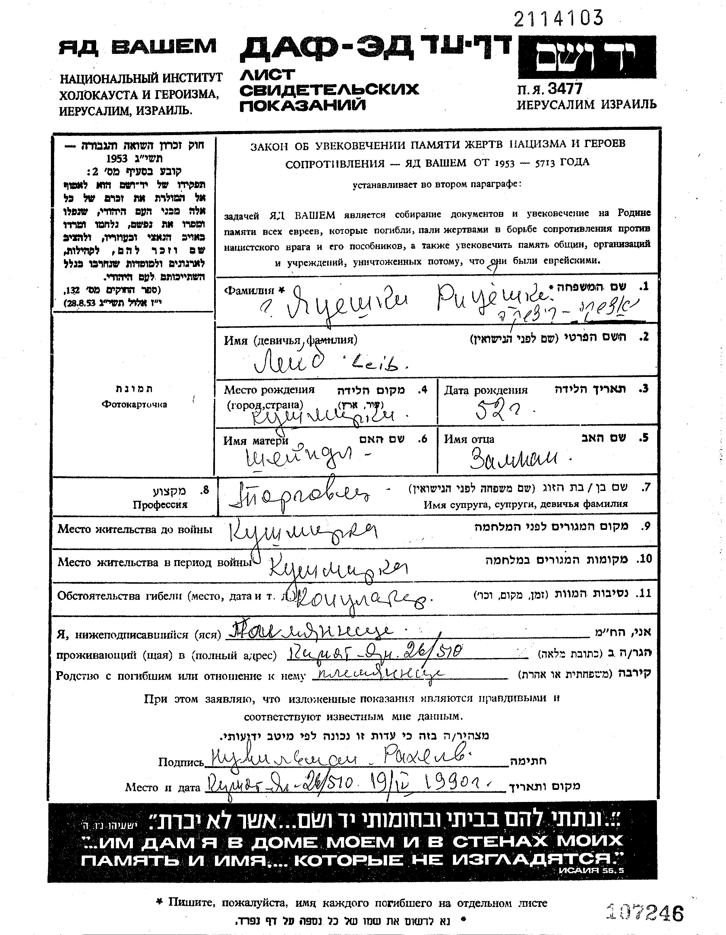 Ritzeshka Yatzeshka Ritzeshke | Leib | Kushmirka, Rumänien | Gedenkblatt |