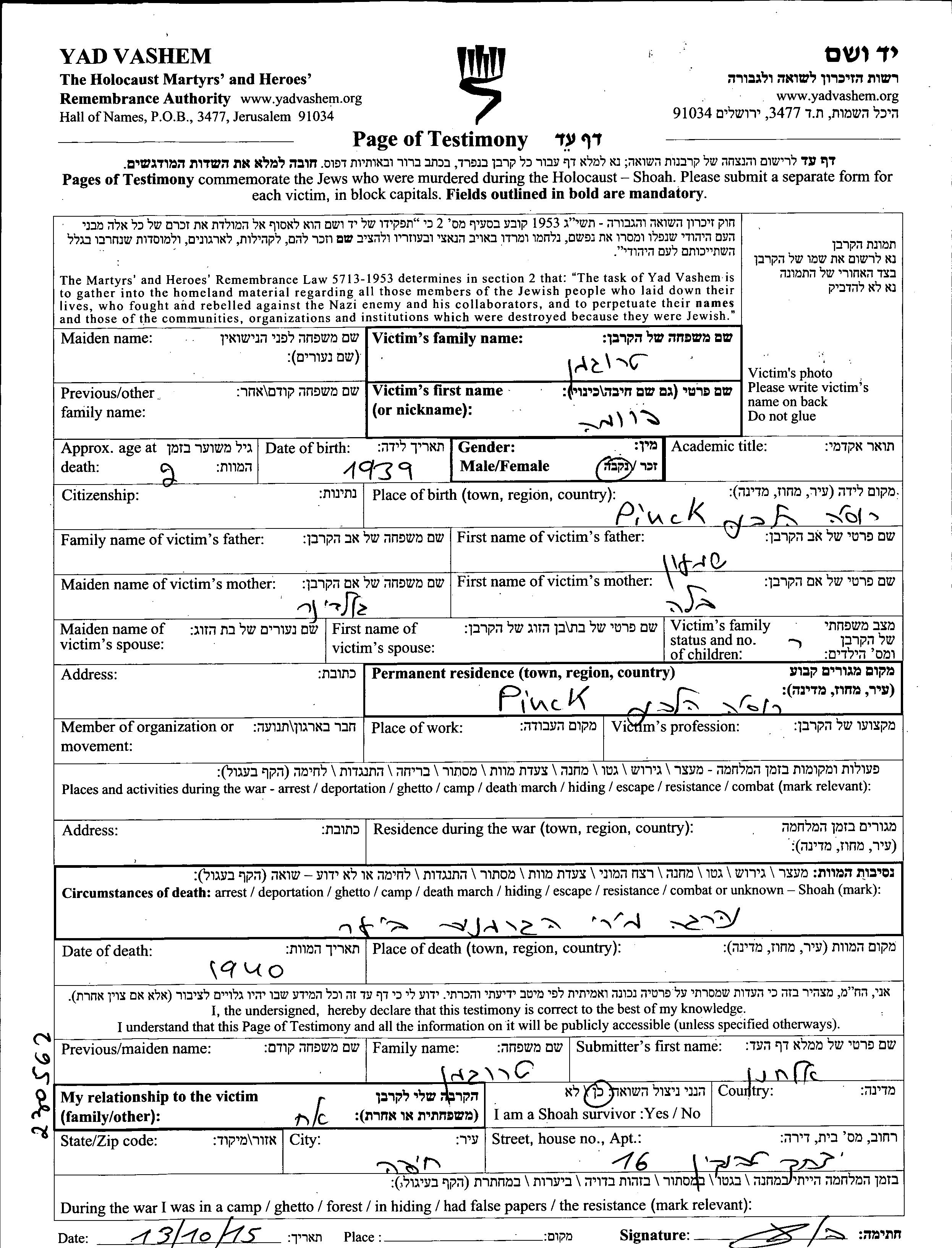 Fruma wurde in der Schoah ermordet. Todesort: unbekannter Ort im Jahr 1940.