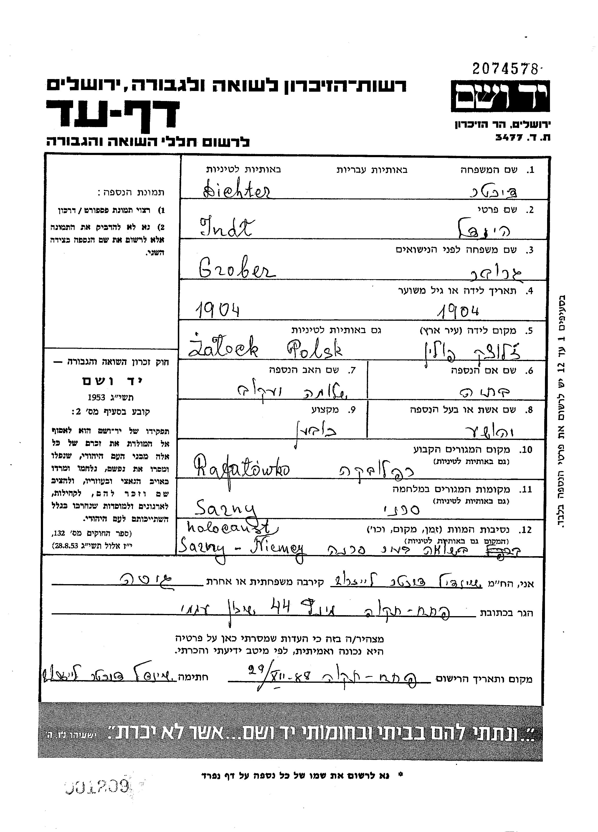 Hinda Dichter, geb. Gruber wurde im Jahr 1904 in Zoludzk, Polen geboren. Sie war Hutmacher/-in. Vor dem Zweiten Weltkrieg lebte sie in Rafałówka, Polen.