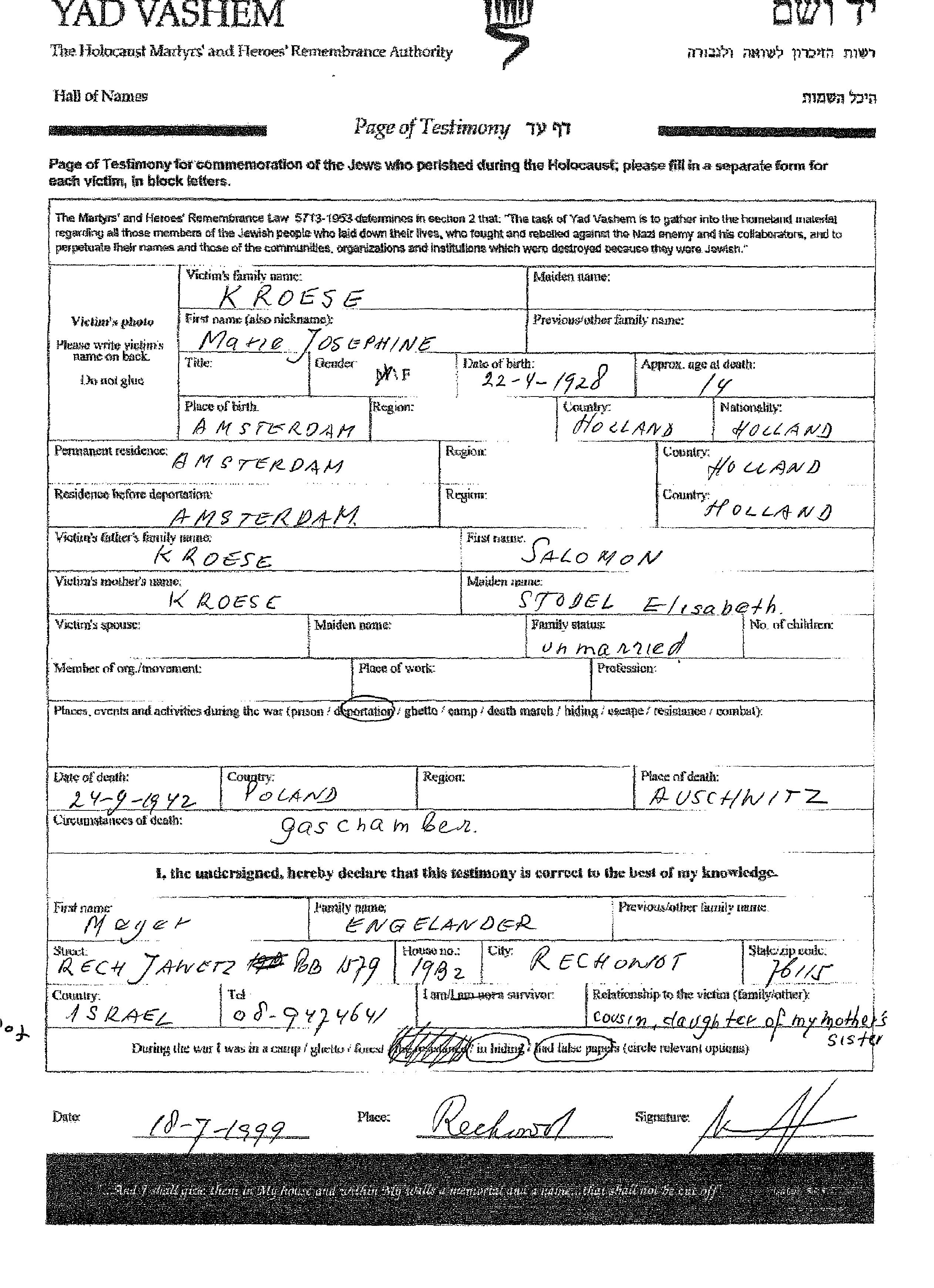 Kroese Marie Josephine 1928 Amsterdam, Niederlande Liste von ermordeten Juden aus Holland