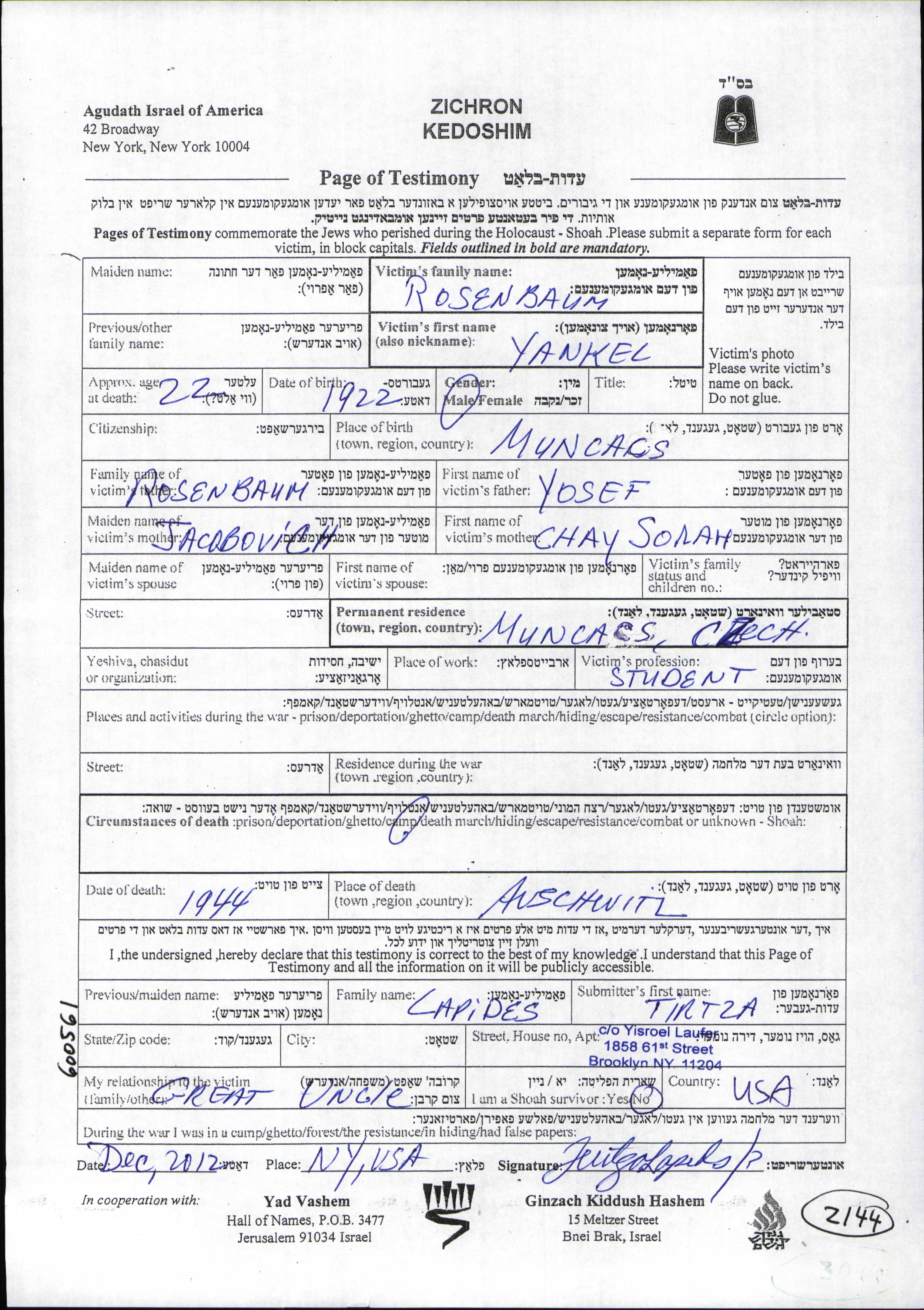 Yaakov Rosenbaum wurde im Jahr 1922 in Mukacevo, Tschechoslowakei geboren. Er war Student. Vor dem Zweiten Weltkrieg lebte er in Mukacevo, Tschechoslowakei.