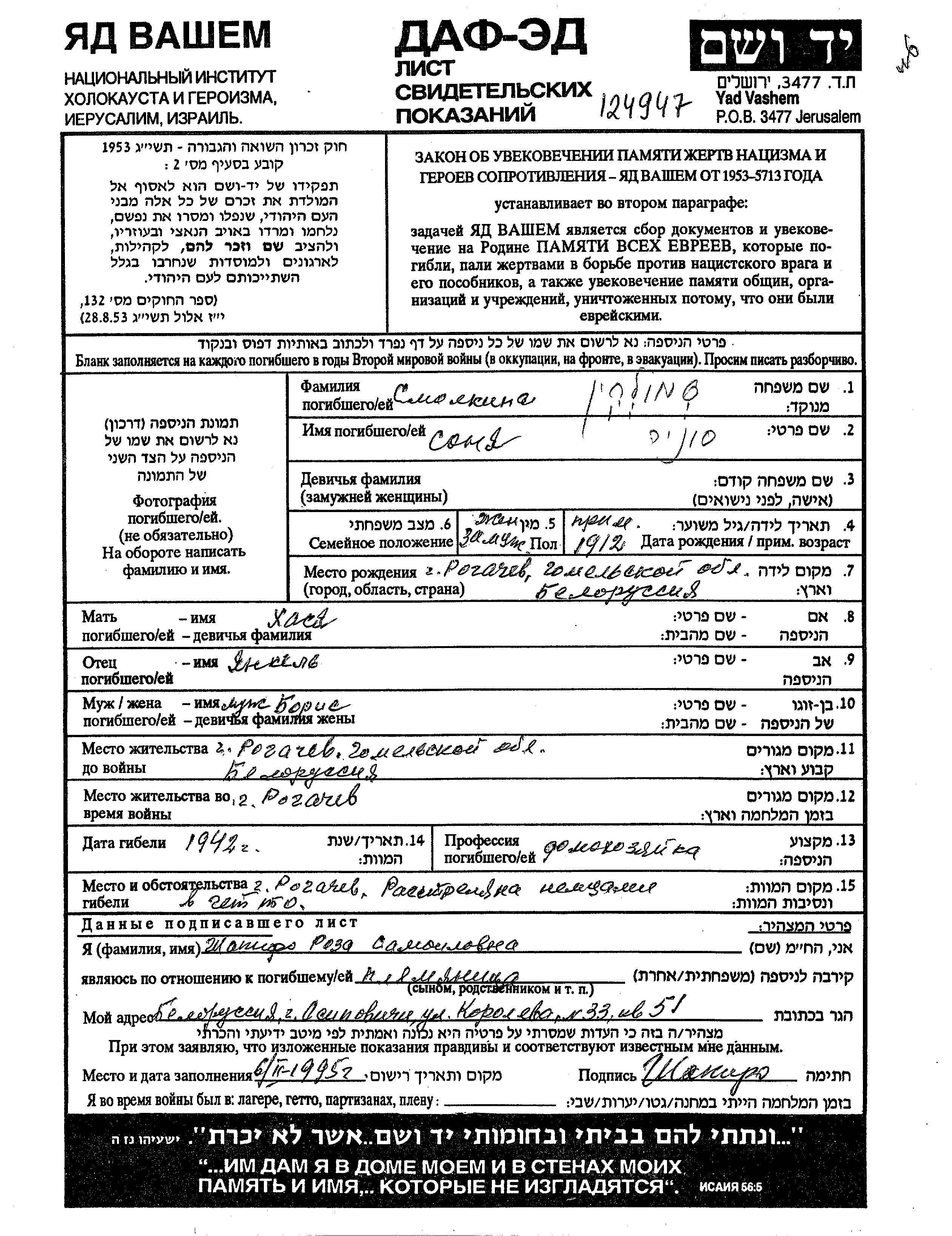 Sonya wurde in der Schoah ermordet. Todesort: Rogachev, Weißrussland (UdSSR).