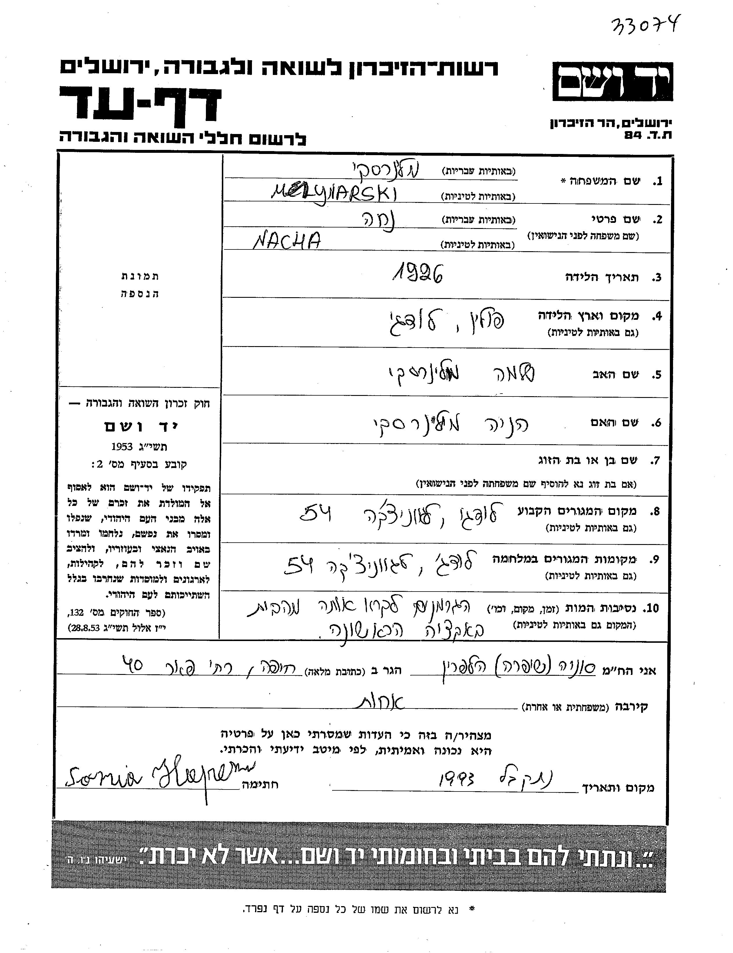 Nacha Melynarski wurde im Jahr 1924 in Lodz, Polen geboren. Sie war Schüler/-in. Vor dem Zweiten Weltkrieg lebte sie in Lodz, Polen.