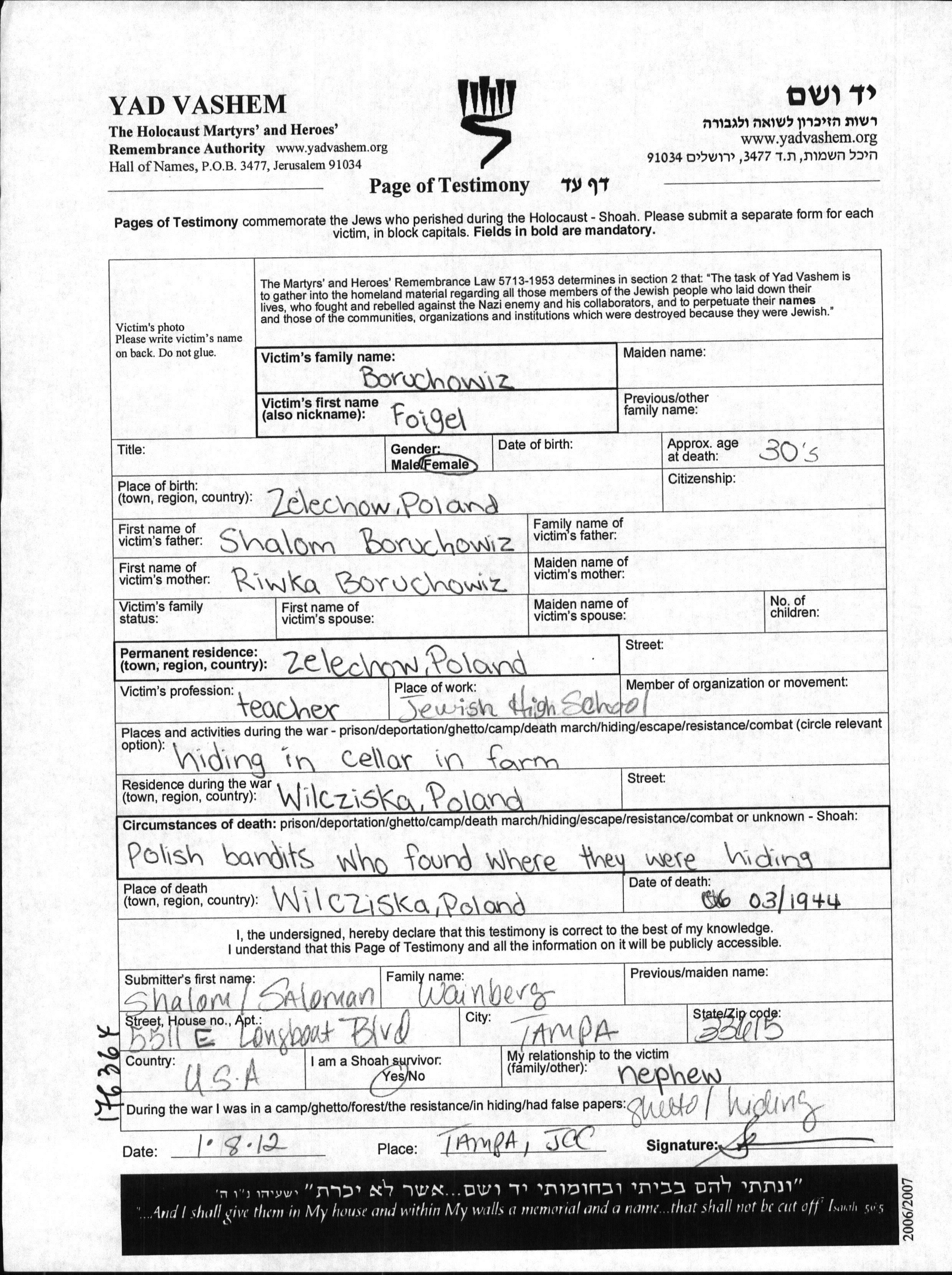 Feiga Boruchowiz, geb. Ben Shalom wurde in Zelechow, Polen geboren. Vor dem Zweiten Weltkrieg lebte sie in Zelechow, Polen.