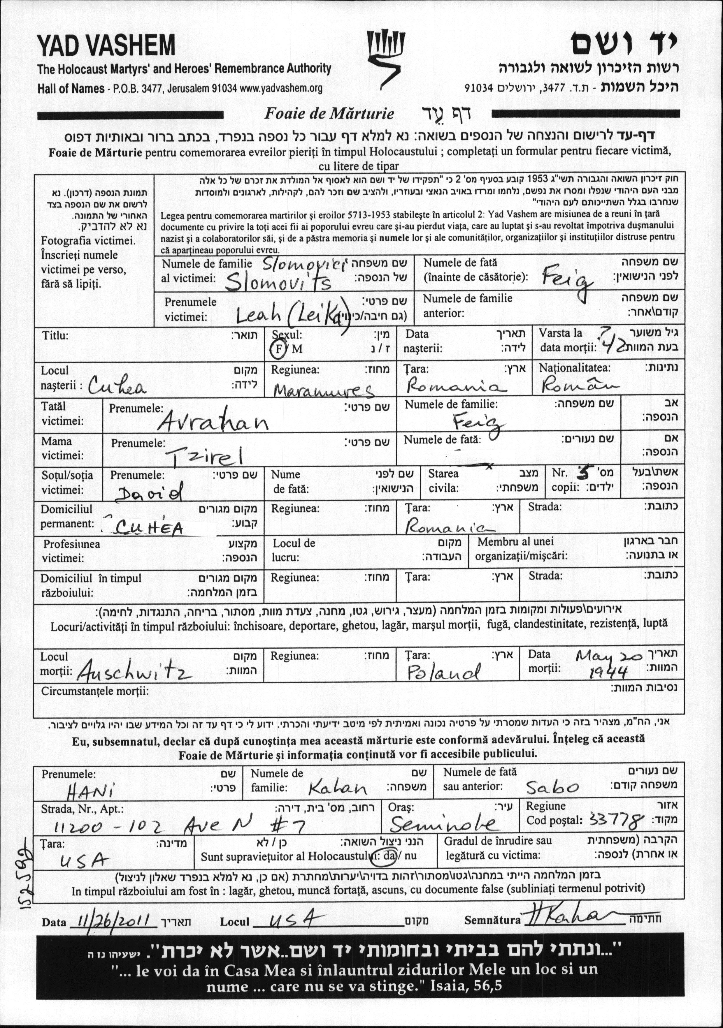 Lea Slomovici, geb. Feig wurde in Cuhea, Rumänien geboren. Sie war Hausfrau. Vor dem Zweiten Weltkrieg lebte sie in Cuhea, Rumänien.