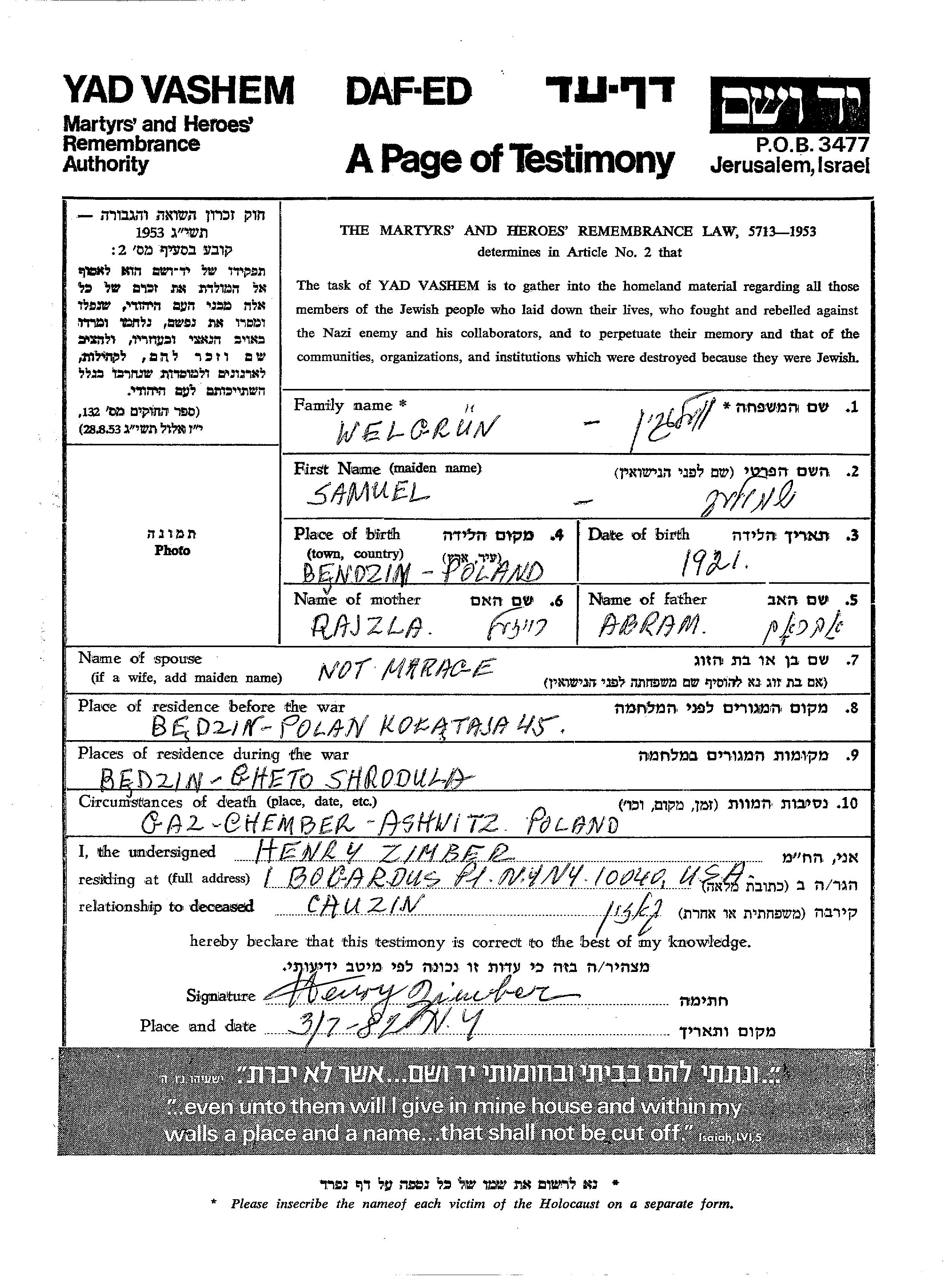 Shmuel Welgruen wurde im Jahr 1921 in Bendzin, Polen geboren. Vor dem Zweiten Weltkrieg lebte er in Będzin, Polen.