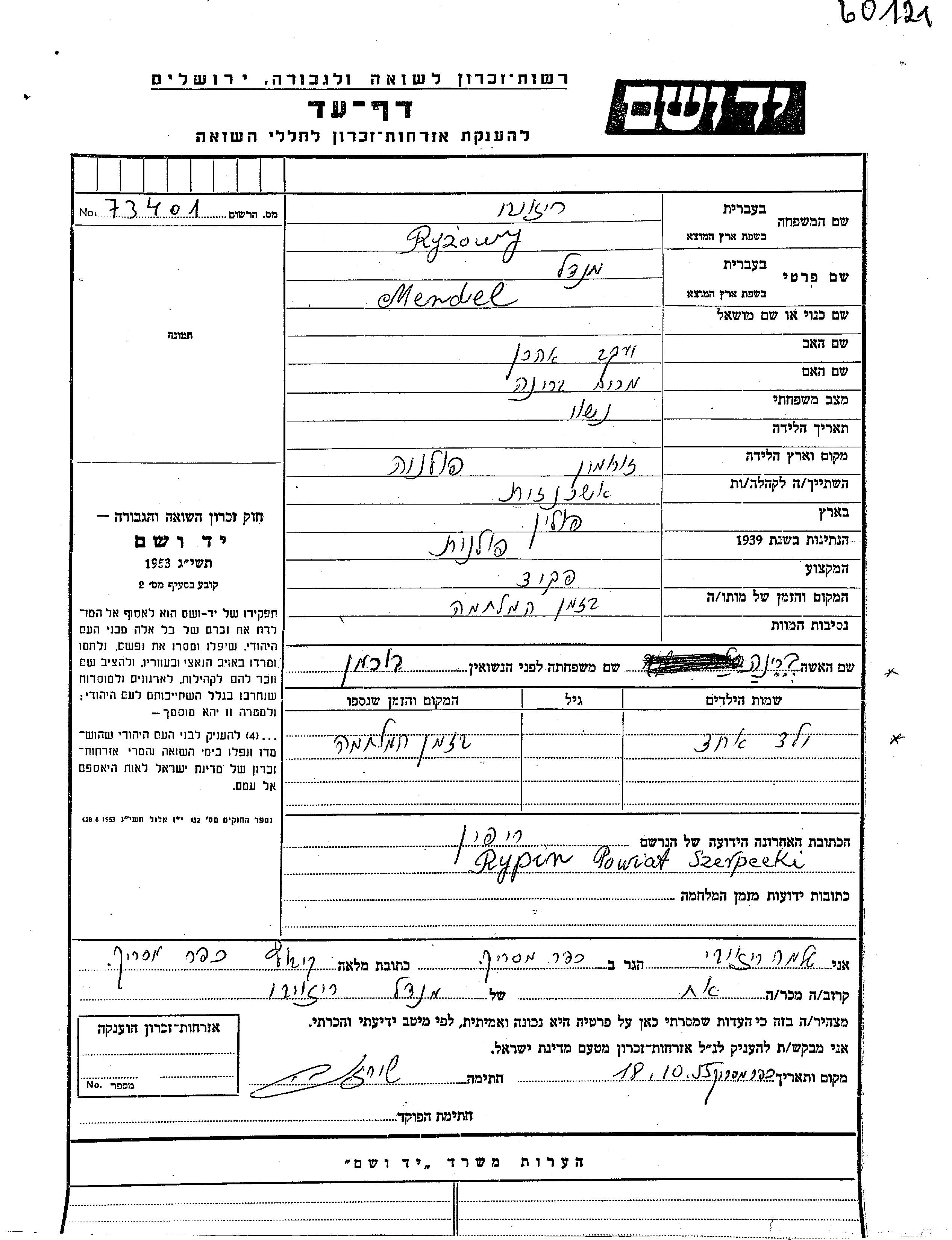 Mendel Ryzowy wurde in Zuromin, Polen geboren. Er war Angestellte/-r. Vor dem Zweiten Weltkrieg lebte er in Polen.