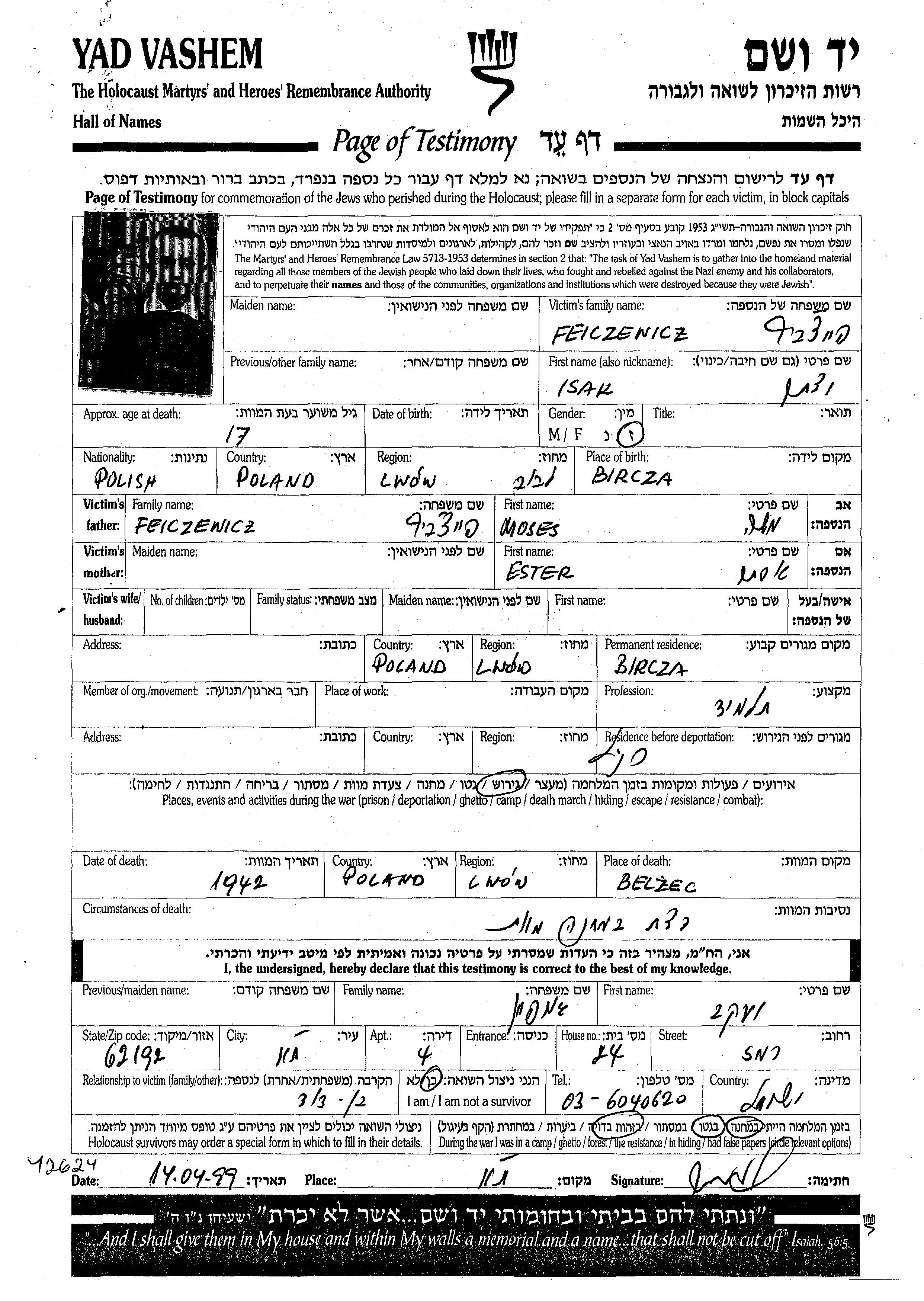 Yitzkhak Feiczewicz wurde im Jahr 1923 in Bircza, Polen geboren. Er war Schüler/-in. Vor dem Zweiten Weltkrieg lebte er in Bircza, Polen.