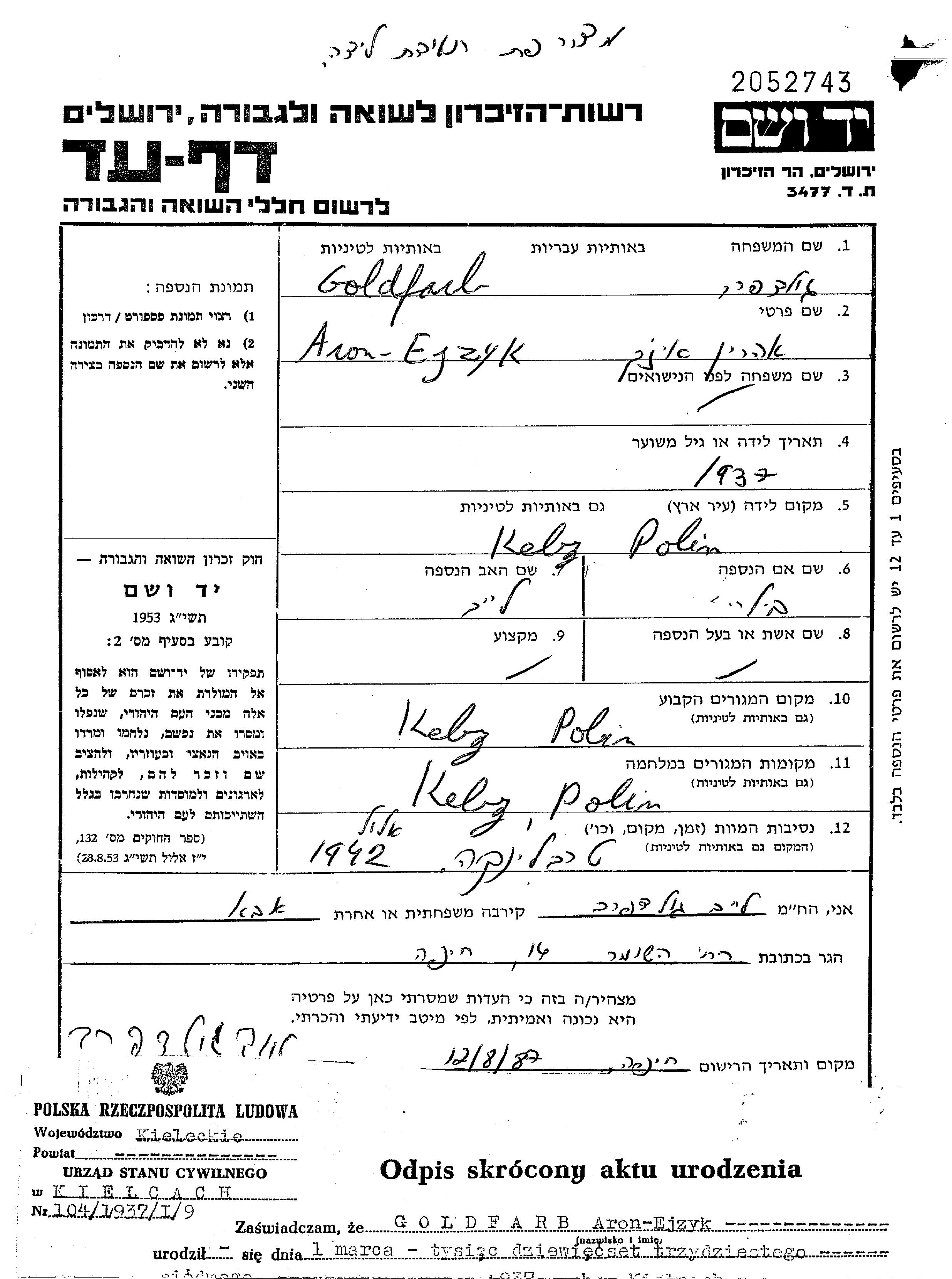 Ejzyk Aharon Goldfarb wurde im Jahr 1937 in Kielce, Polen geboren. Vor dem Zweiten Weltkrieg lebte er in Kielce, Polen.
