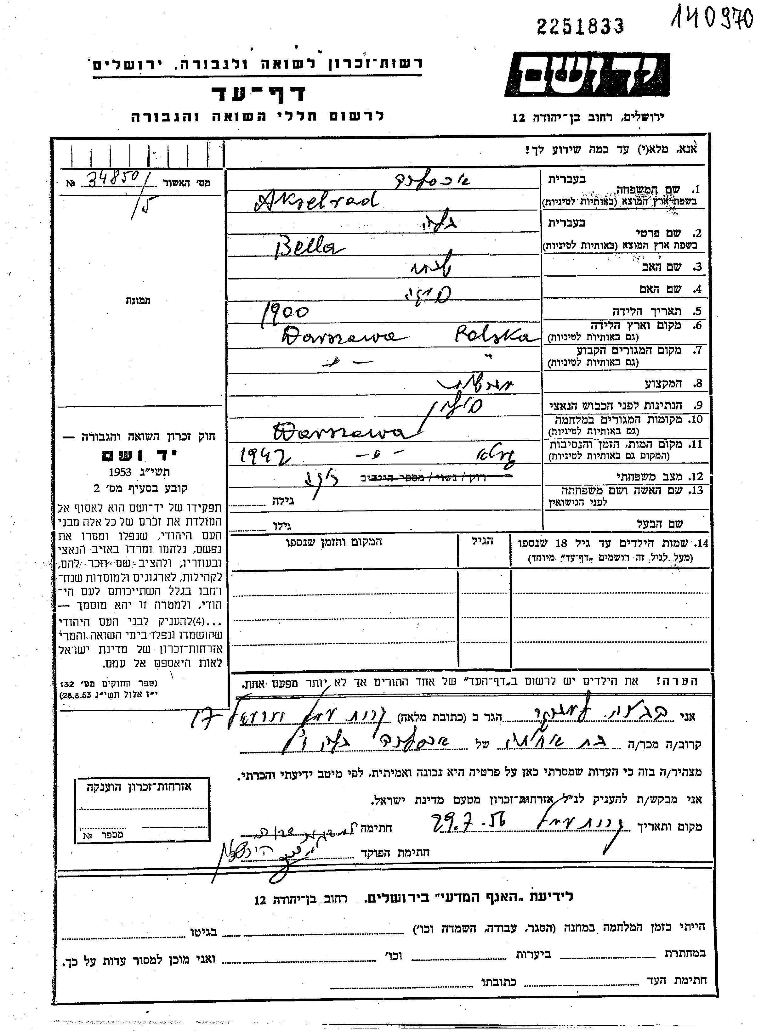 Bela Akselrad wurde in Warszawa, Polen geboren. Sie war Handwerker. Vor dem Zweiten Weltkrieg lebte sie in Warszawa, Polen.