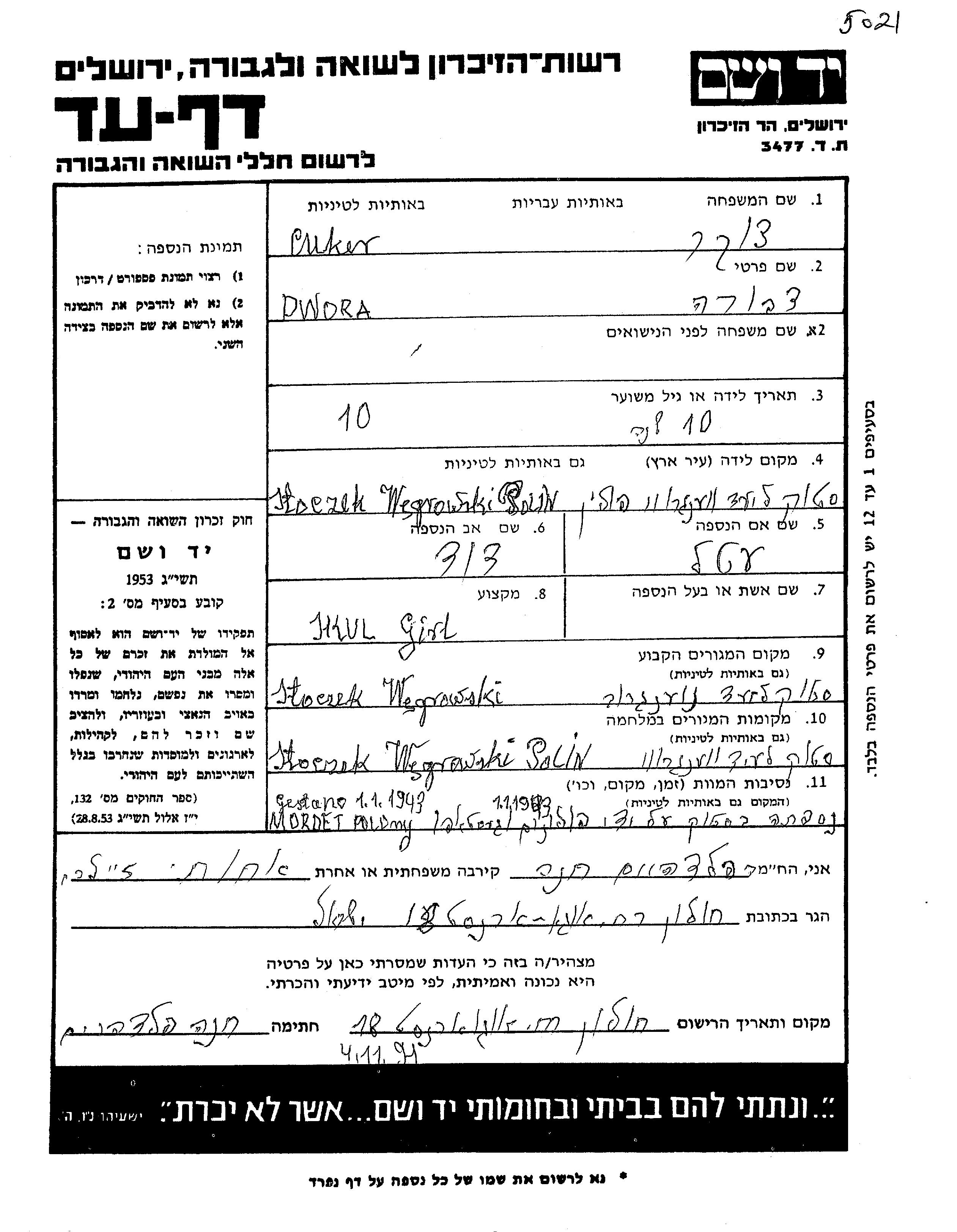 Dvora Cuker wurde in Stoczek Wegrowski, Polen geboren. Sie war Schüler/-in. Vor dem Zweiten Weltkrieg lebte sie in Stoczek Wegrowski, Polen.