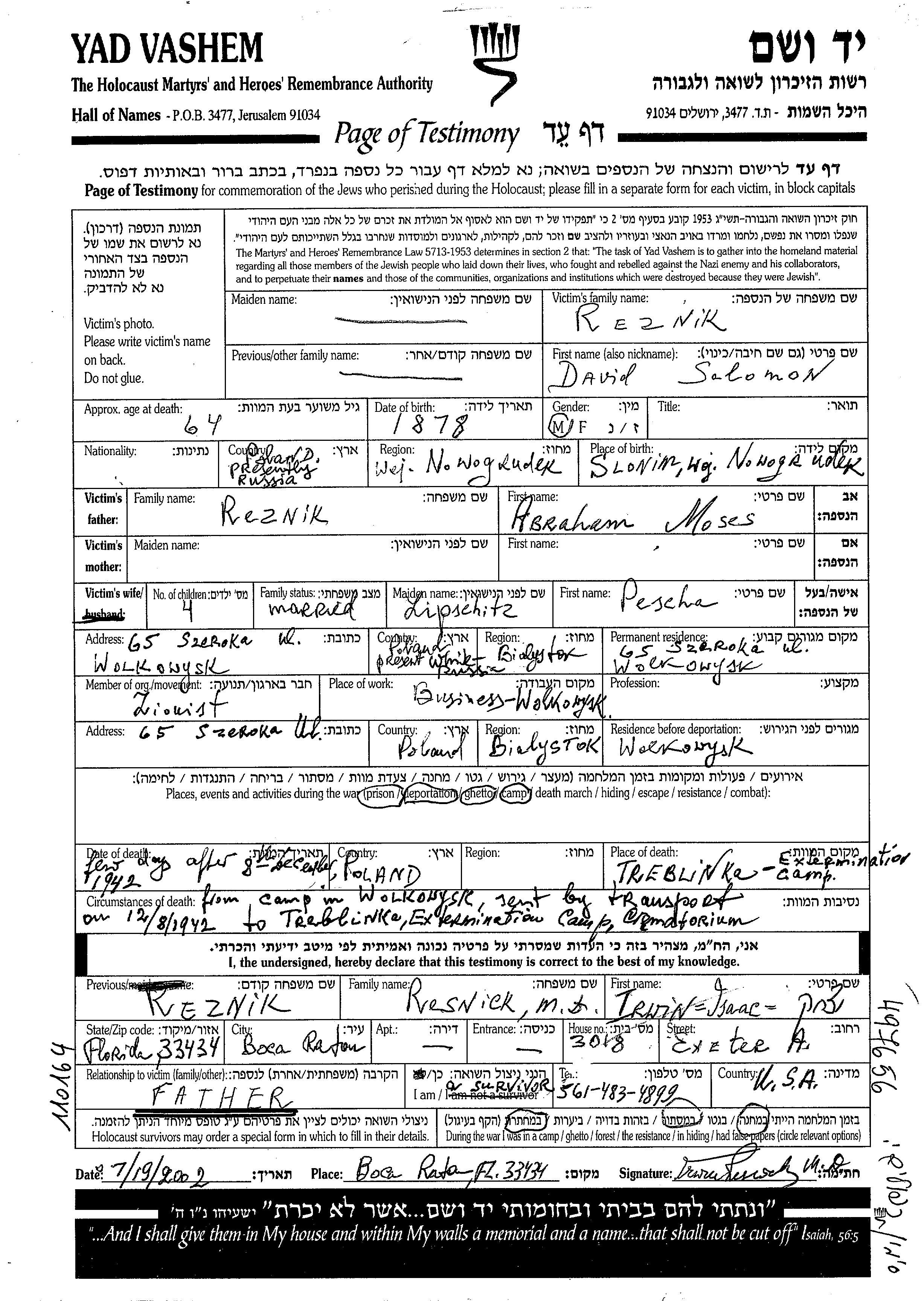 Solomon David Reznik wurde im Jahr 1878 in Slonim, Polen geboren. Vor dem Zweiten Weltkrieg lebte er in Wolkowysk, Polen.