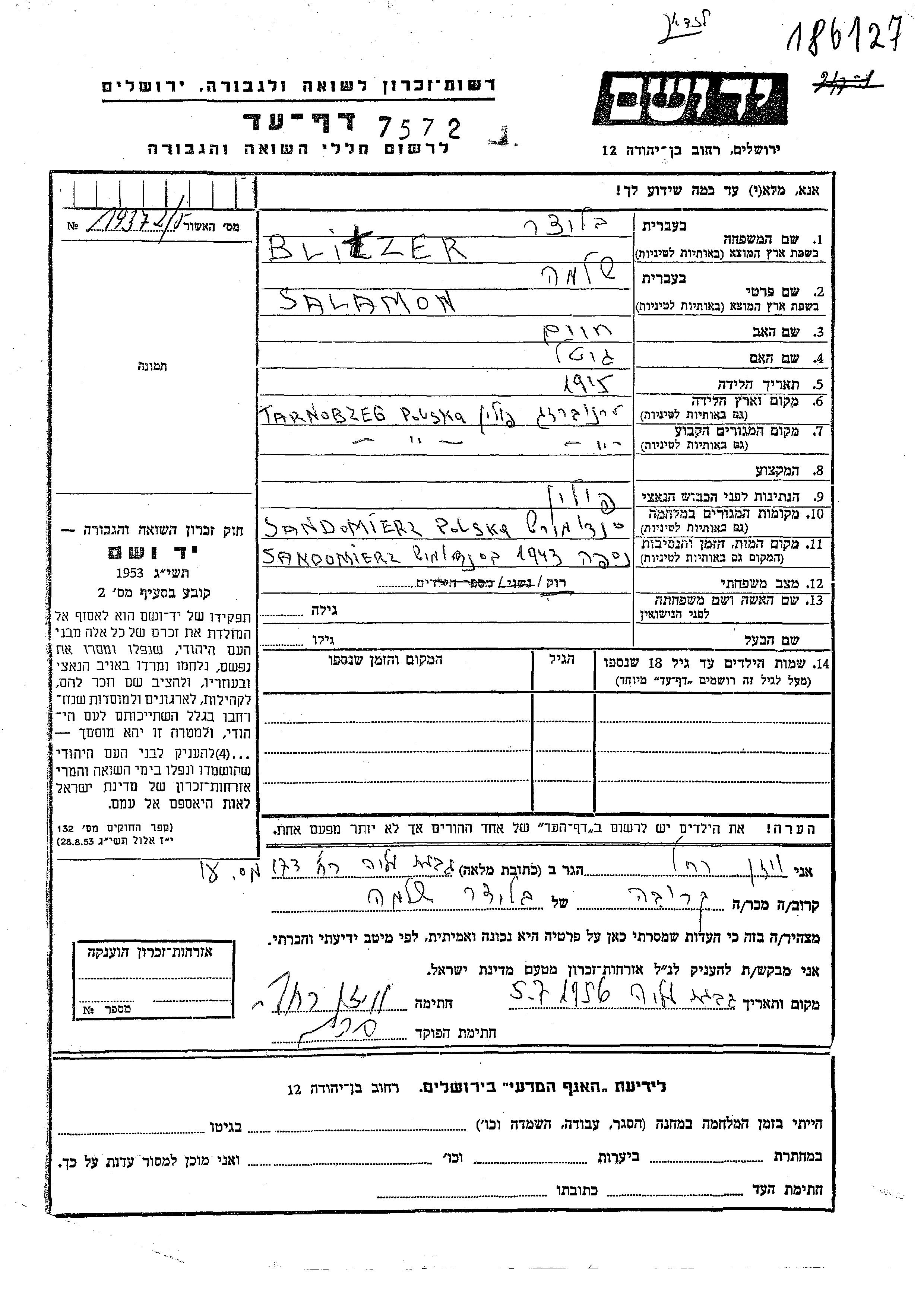 Shlomo Blitzer wurde in Tarnobrzeg, Polen geboren. Er war Kaufmann/-frau. Vor dem Zweiten Weltkrieg lebte er in Tarnobrzeg, Polen.