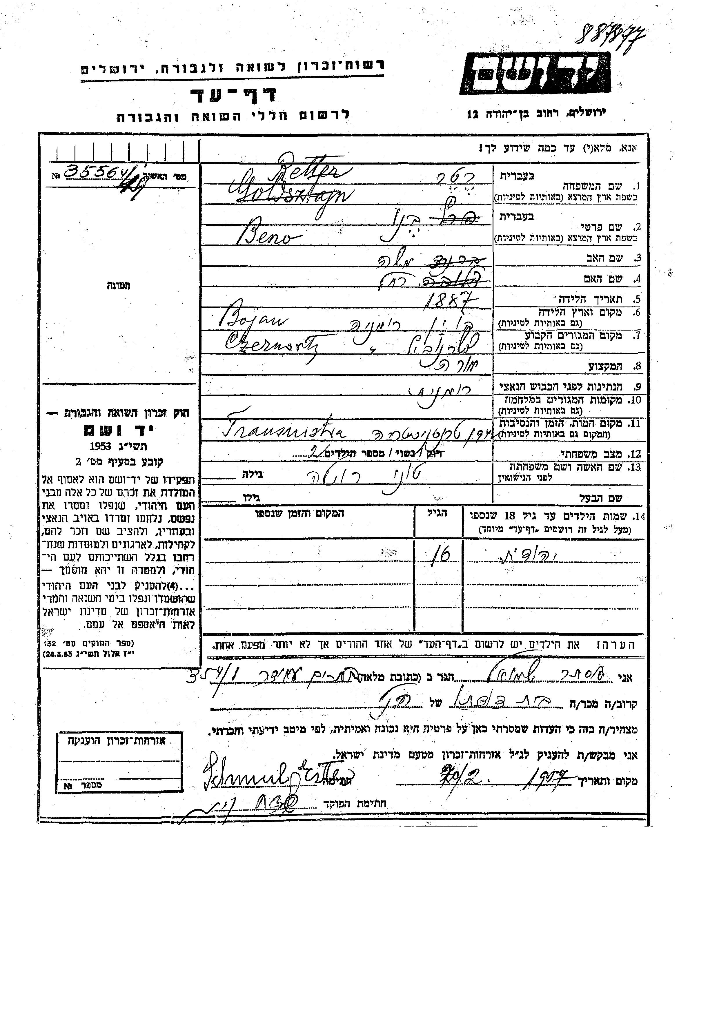 Bernhard Berl Retter wurde im Jahr 1887 in Bojan, Rumänien geboren. Er war Lehrer/in. Vor dem Zweiten Weltkrieg lebte er in Czernowitz, Rumänien.