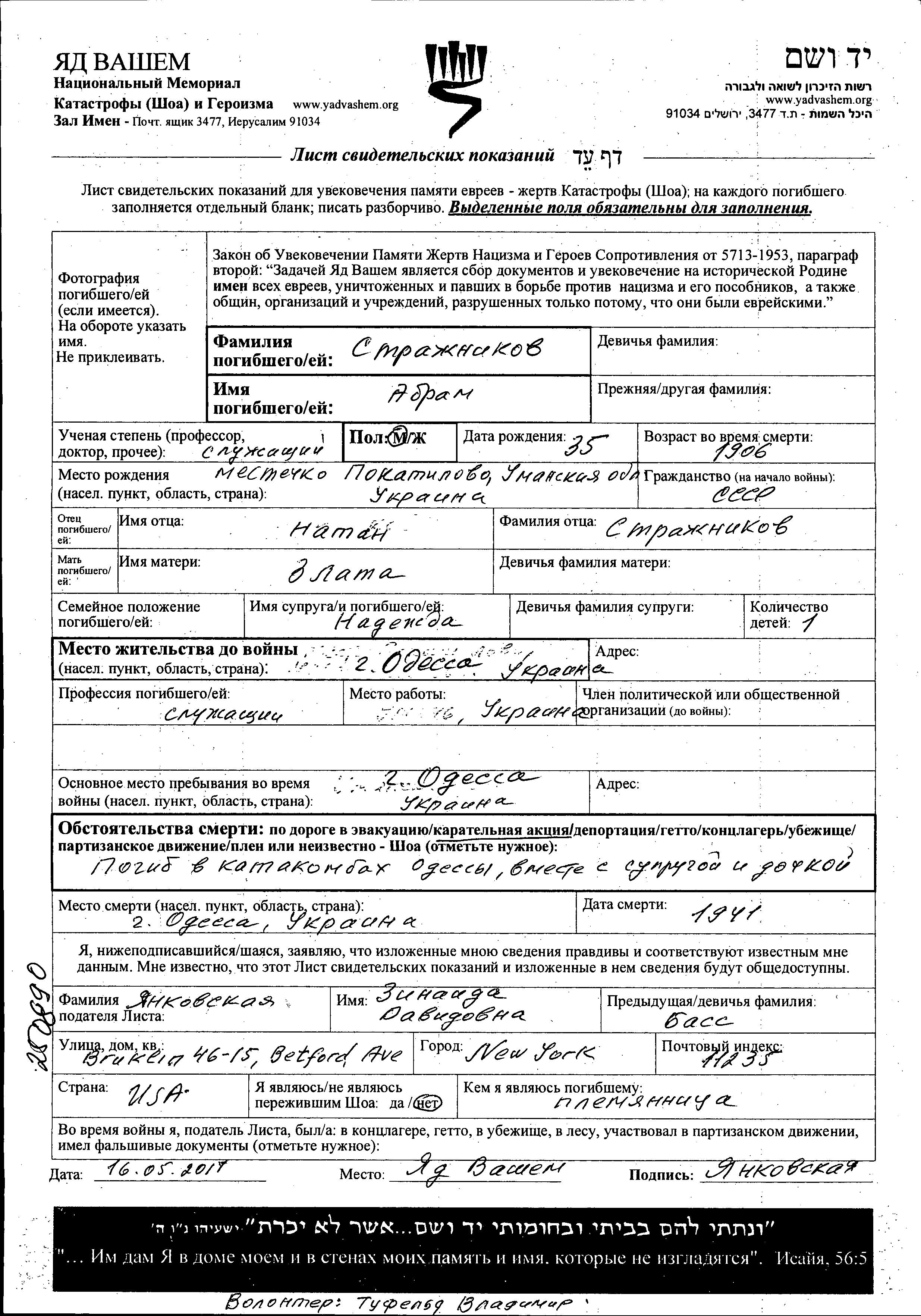 Strazhnikov | Avraham | 1902 | Odessa, Ukraine (UdSSR) | Gedenkblatt |