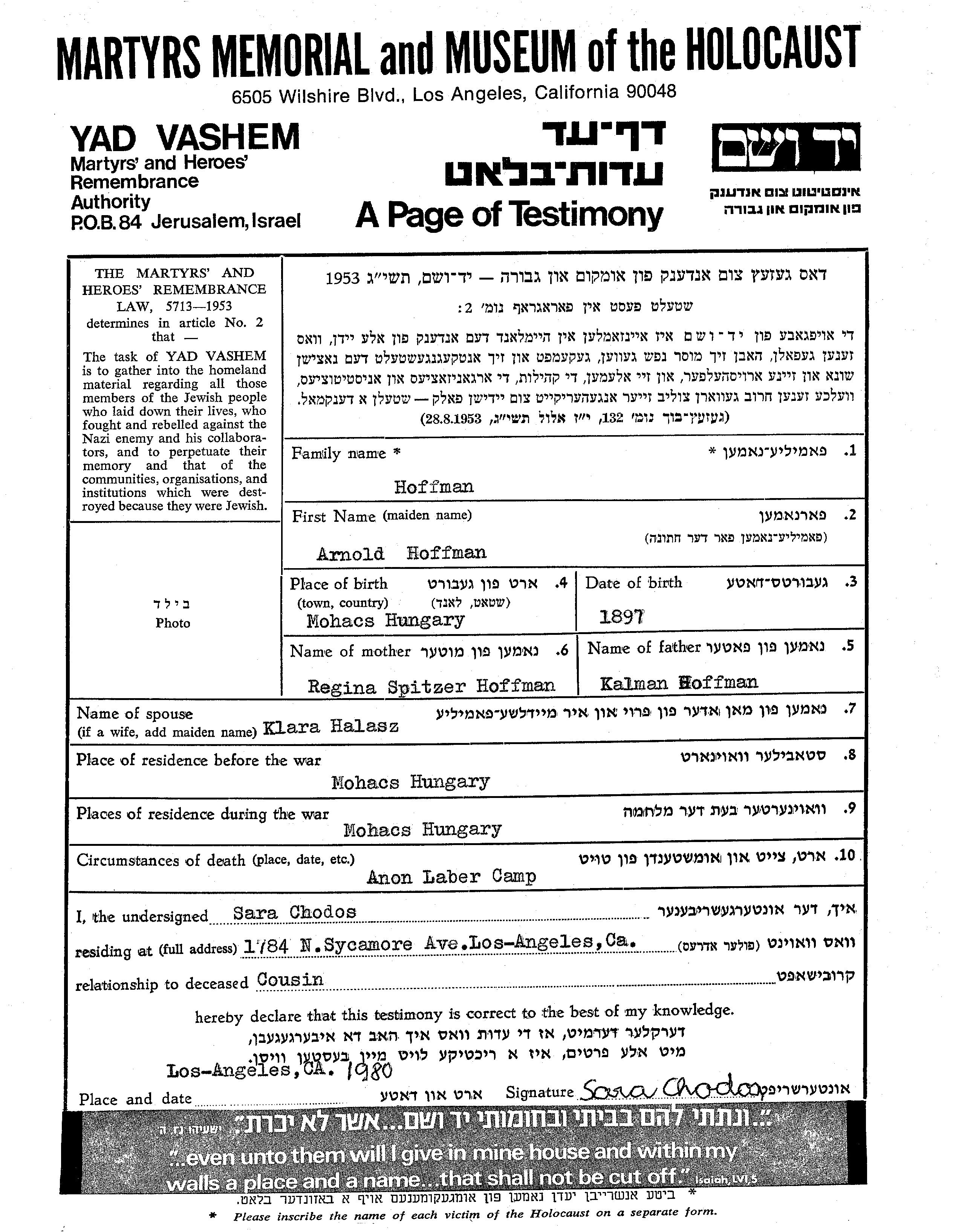 Arnold Hoffman wurde im Jahr 1897 in Mohacs, Ungarn geboren. Er war der Sohn von Kalman und Regina. Vor dem Zweiten Weltkrieg lebte er in Mohacs, Ungarn. Während des Krieges war er in Mohacs, Ungarn.