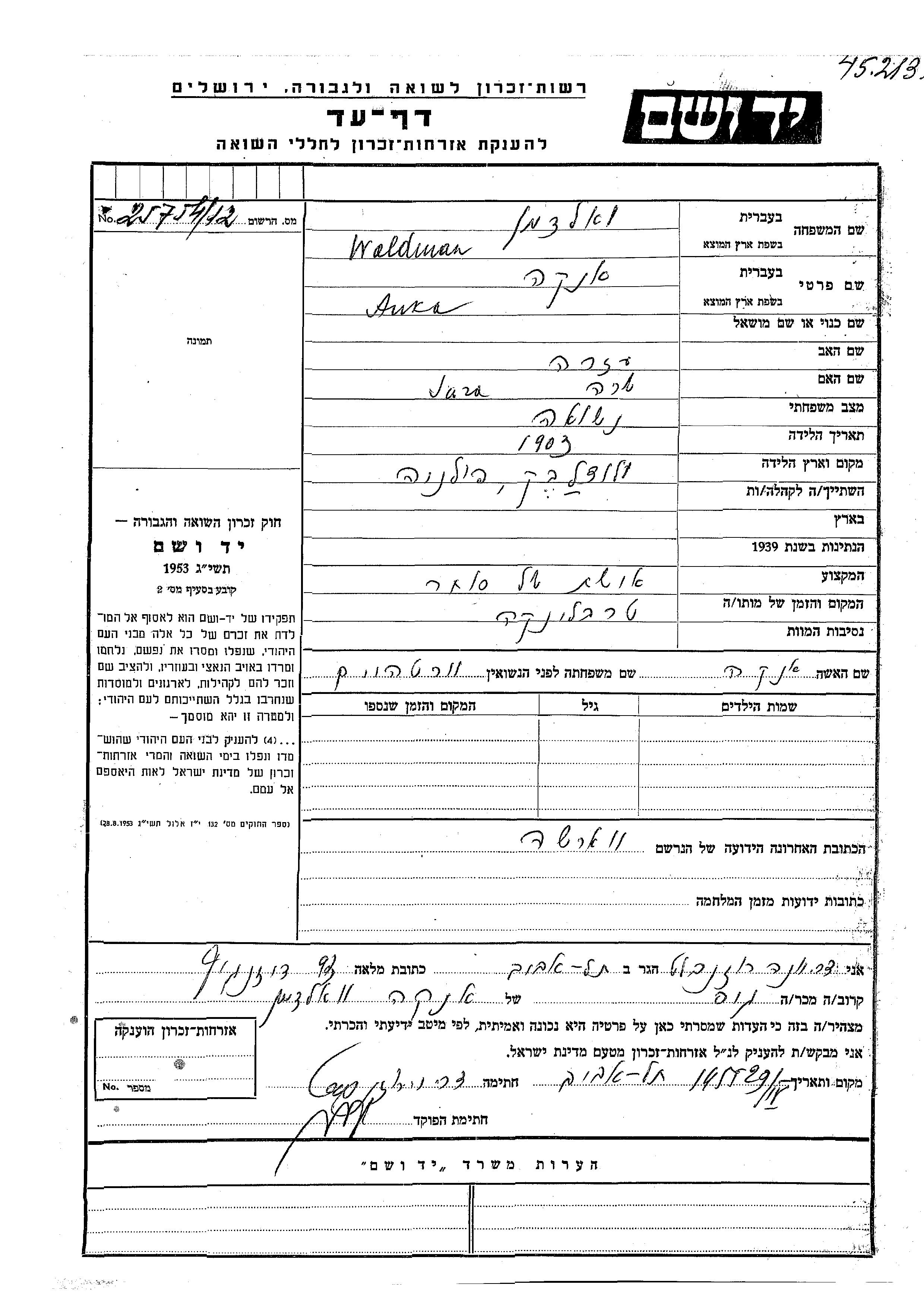 Anka Waldman, geb. Wertheim wurde im Jahr 1903 in Wloclawek, Polen geboren. Vor dem Zweiten Weltkrieg lebte sie in Warszawa, Polen.