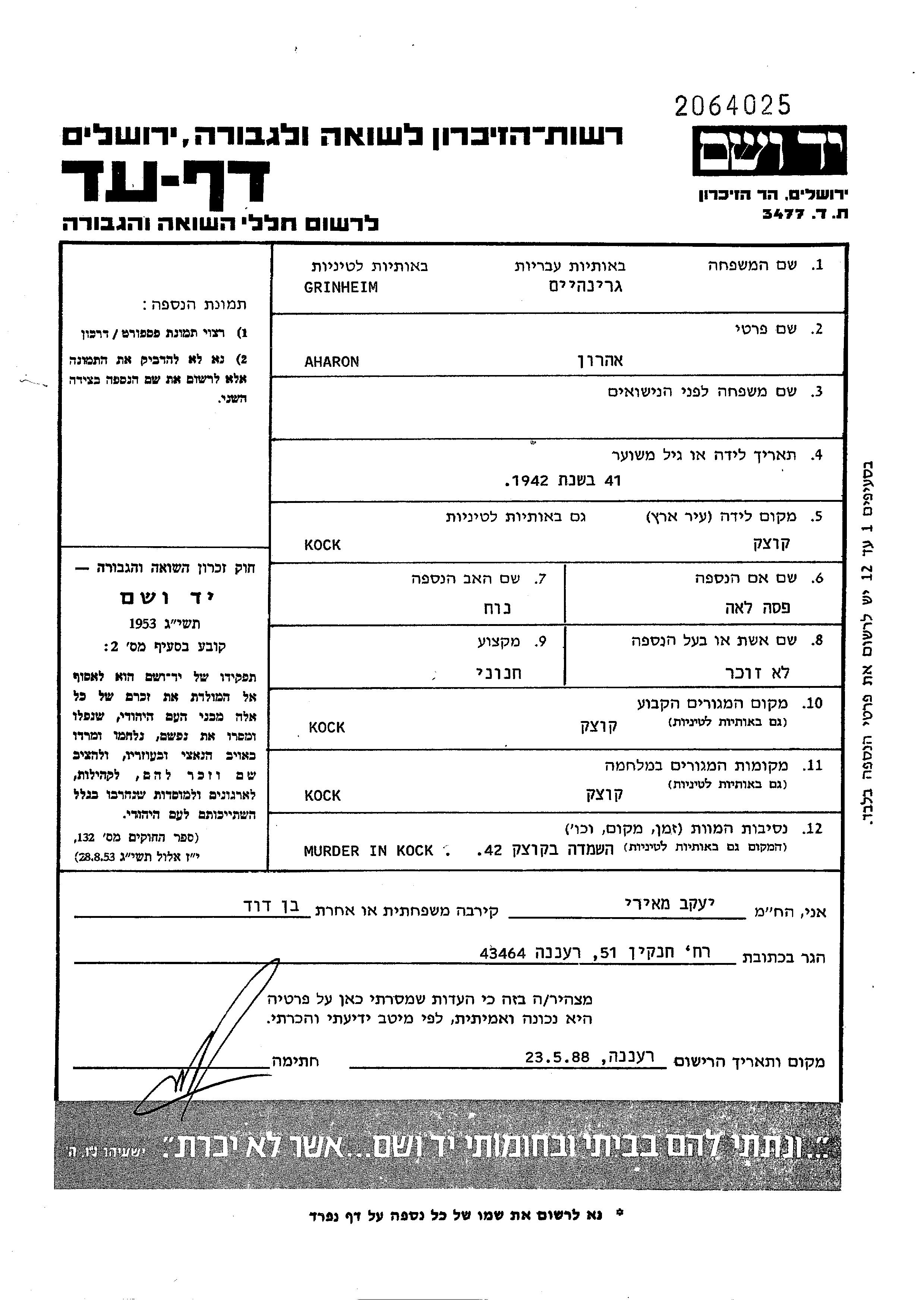 Aharon wurde in der Schoah ermordet. Todesort: Kock, Polen im Jahr 1942.