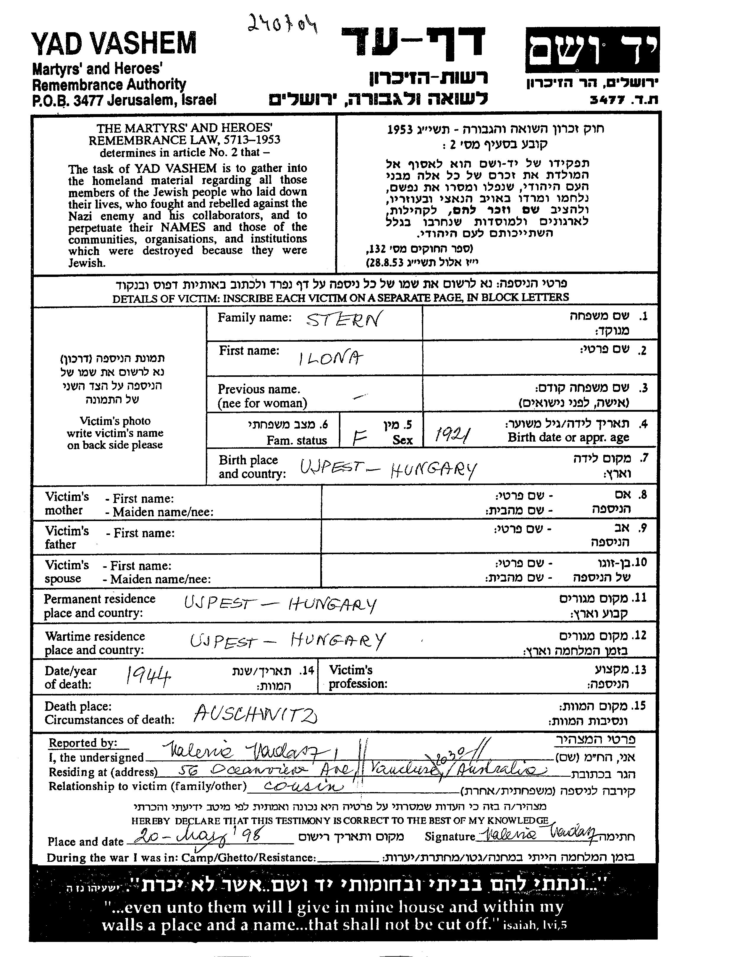 Ilona Shtern wurde im Jahr 1921 in Ujpest, Ungarn geboren. Vor dem Zweiten Weltkrieg lebte sie in Ujpest, Ungarn.