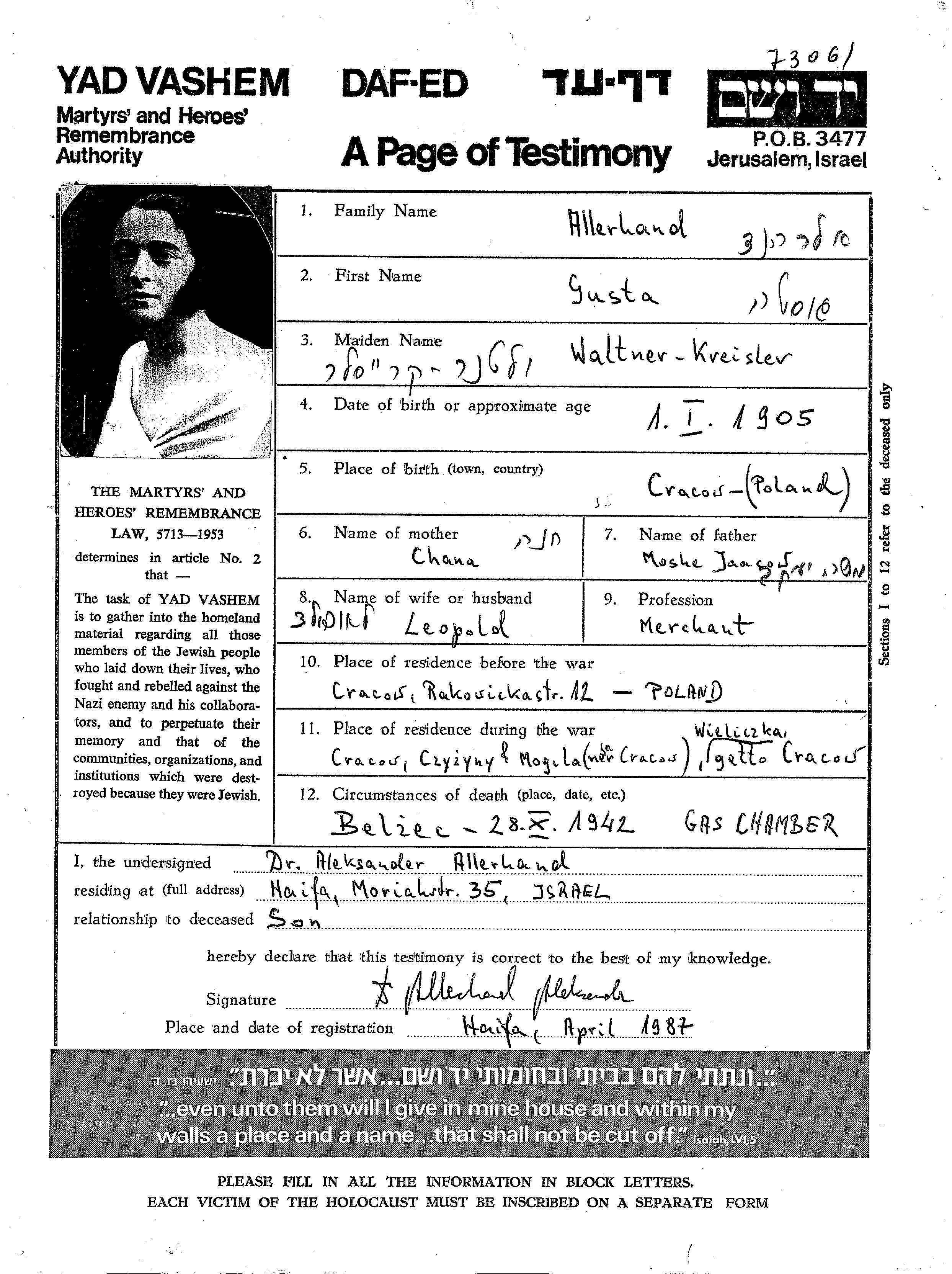 Ester Gusta Ditel Gitl Allerhand, geb. Waltner wurde im Jahr 1904 in Krakow, Polen geboren. Sie war Kaufmann/-frau. Vor dem Zweiten Weltkrieg lebte sie in Krakow, Polen.
