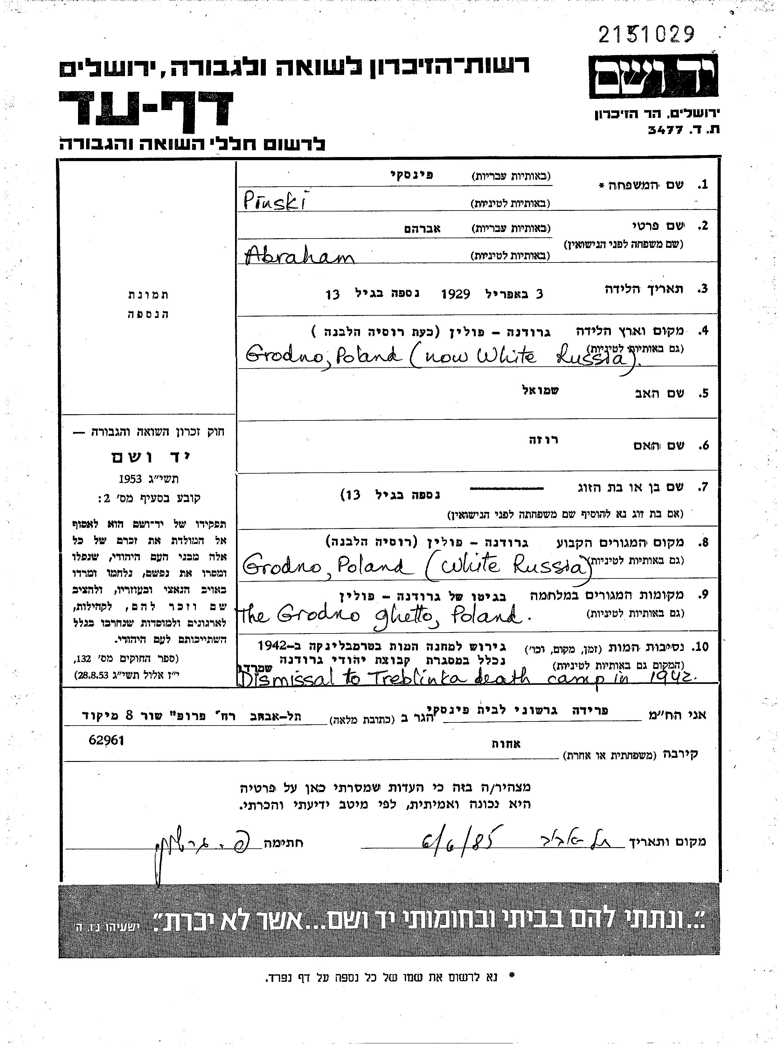 Yosef Avraham Pinski wurde im Jahr 1929 in Grodno, Polen geboren. Vor dem Zweiten Weltkrieg lebte er in Grodno, Polen.