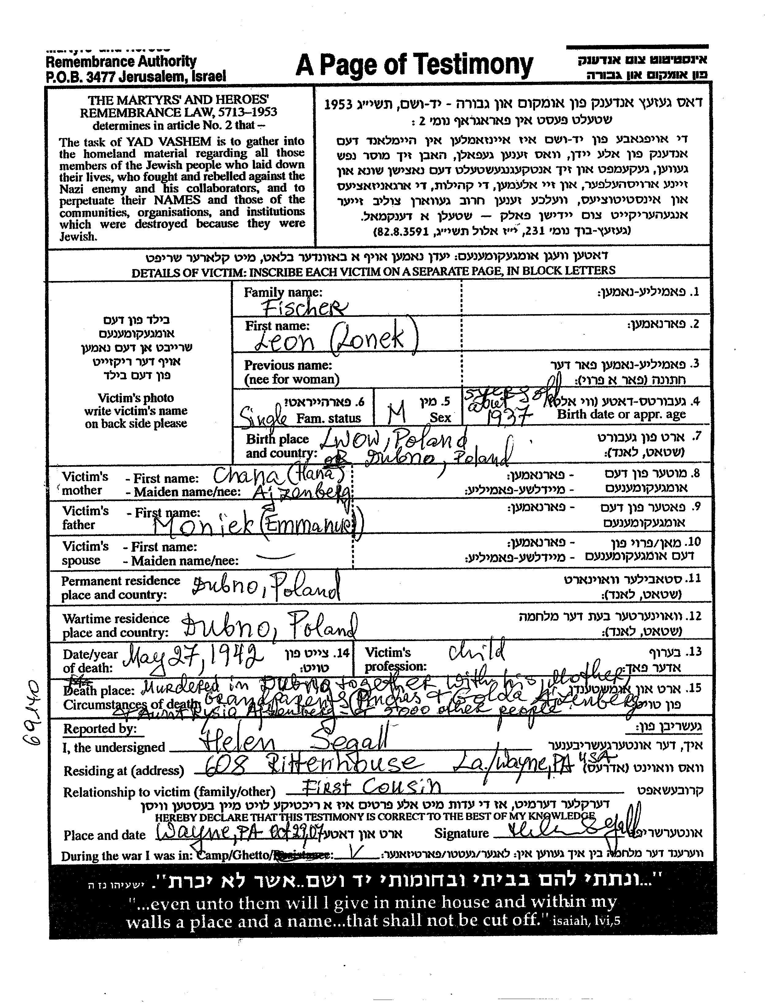 Lonek Leon Fischer wurde im Jahr 1937 in Lwow, Polen geboren. Vor dem Zweiten Weltkrieg lebte er in Dubno, Polen.