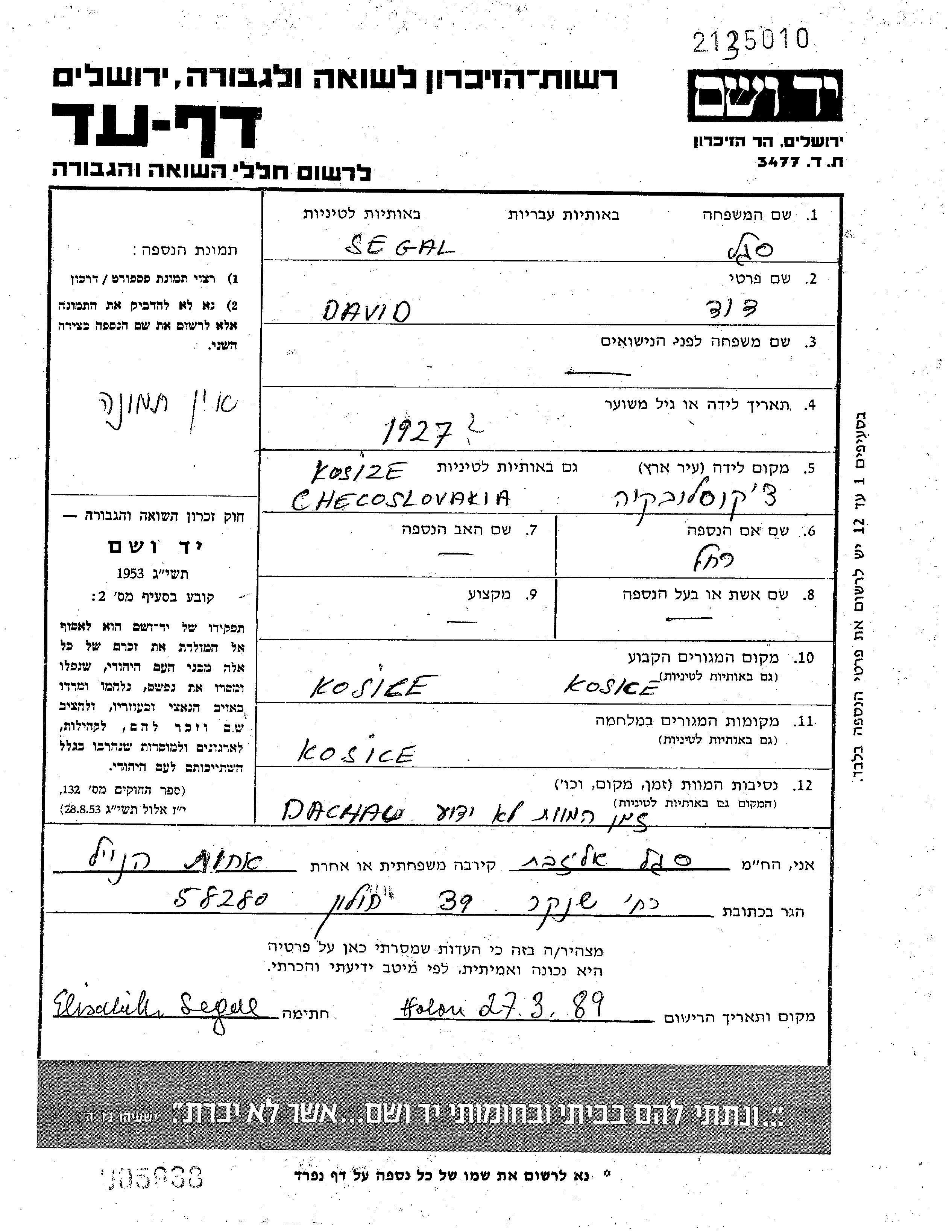 David Segal wurde im Jahr 1925 in Kosice, Tschechoslowakei geboren. Vor dem Zweiten Weltkrieg lebte er in Kosice, Tschechoslowakei.
