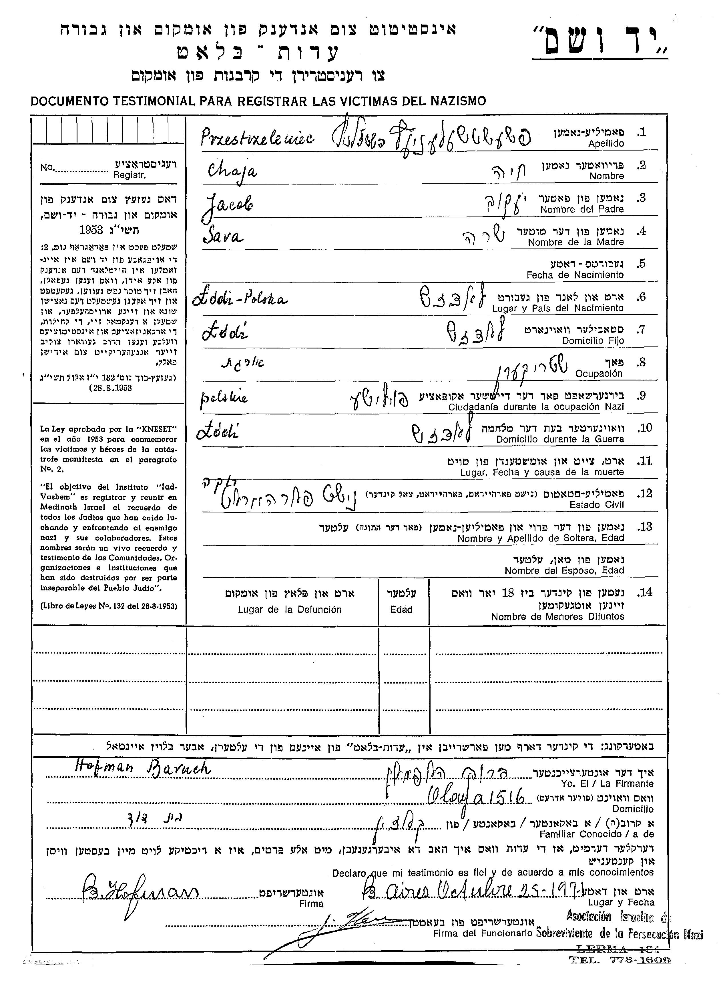 Pearl Khaia Przestrzeleniec wurde in Lodz, Polen geboren. Sie war Stricker/-in. Vor dem Zweiten Weltkrieg lebte sie in Lodz, Polen.