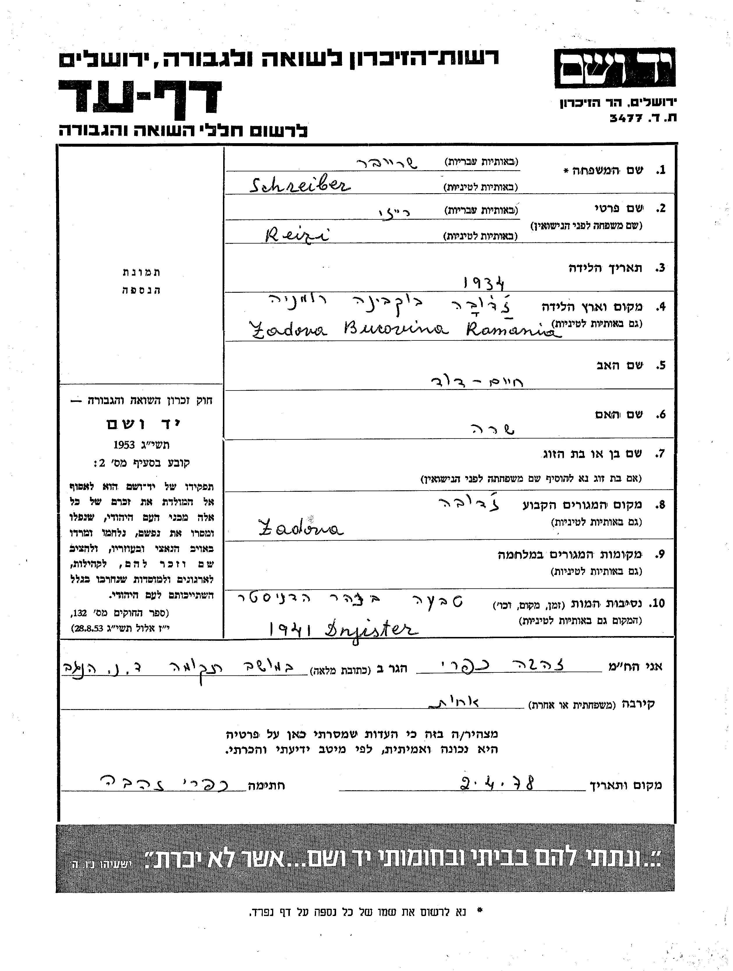 Reizi Schreiber wurde im Jahr 1934 in Zadowa, Rumänien geboren. Sie war die Tochter von Khaim David und Sara. Vor dem Zweiten Weltkrieg lebte sie in Zadowa, Rumänien.