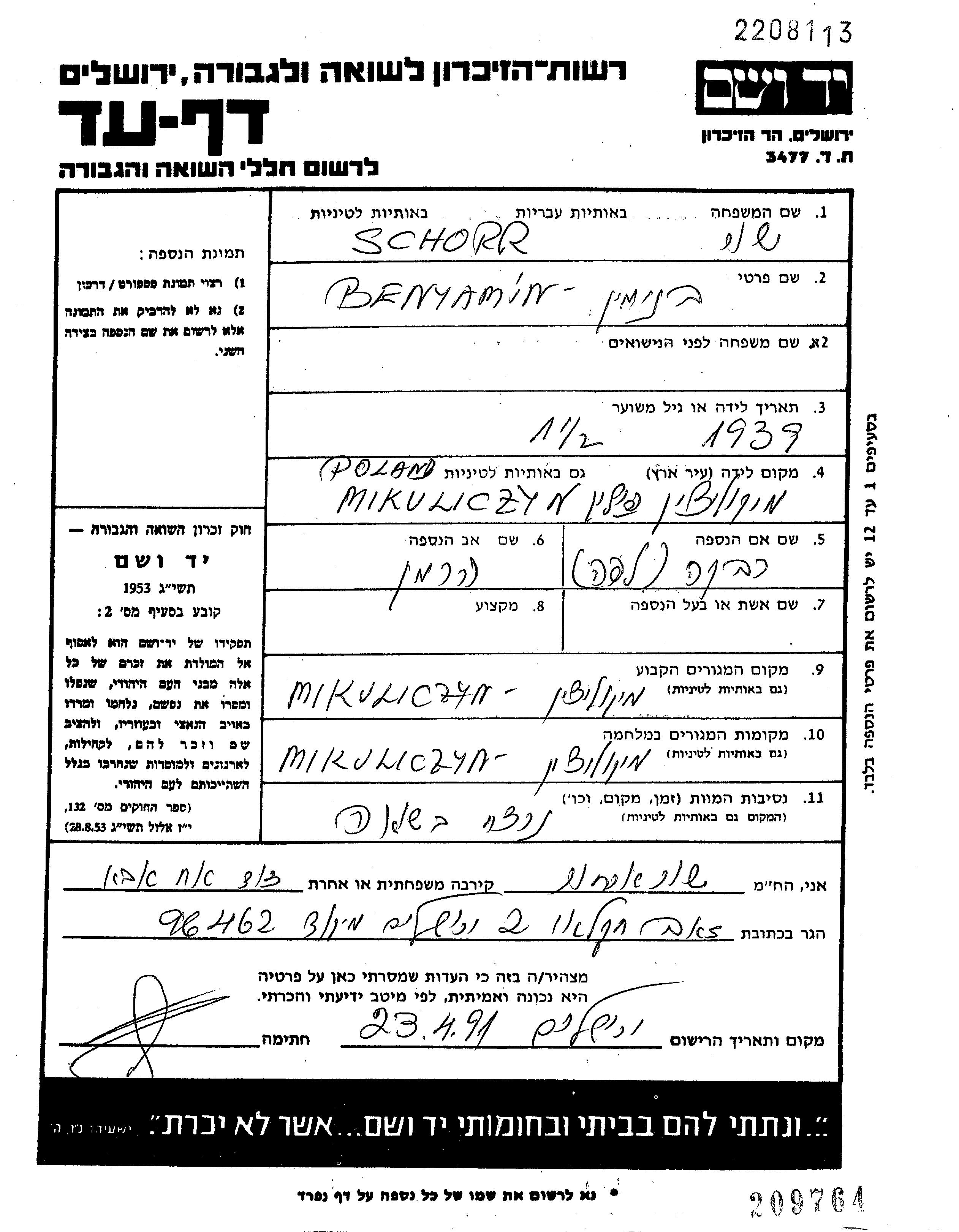 Beniamin Schorr wurde in Mikuliczyn, Polen geboren. Vor dem Zweiten Weltkrieg lebte er in Mikuliczyn, Polen.