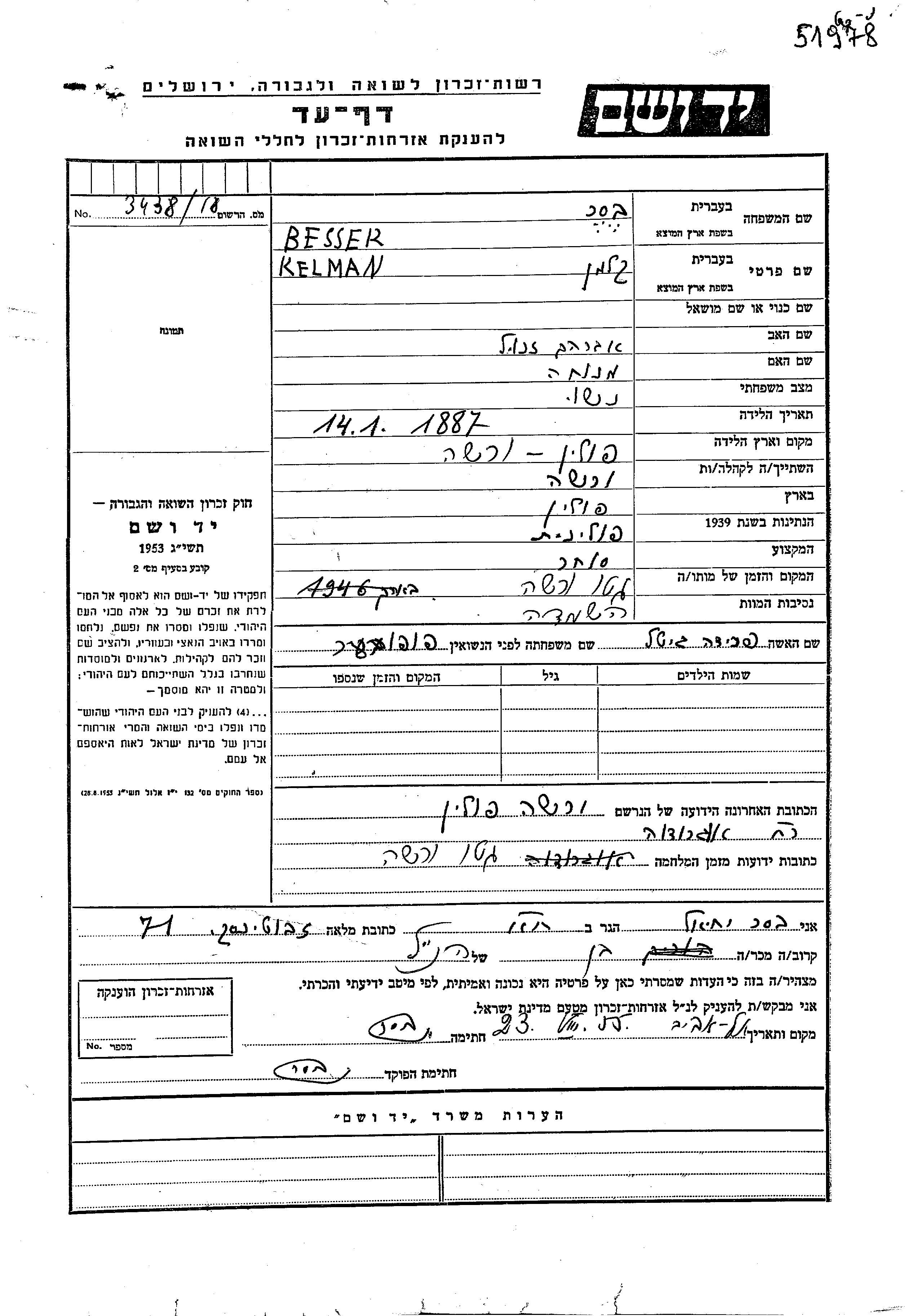 Kalman wurde in der Schoah ermordet. Todesort: Warszawa, Polen im Jahr 1942.