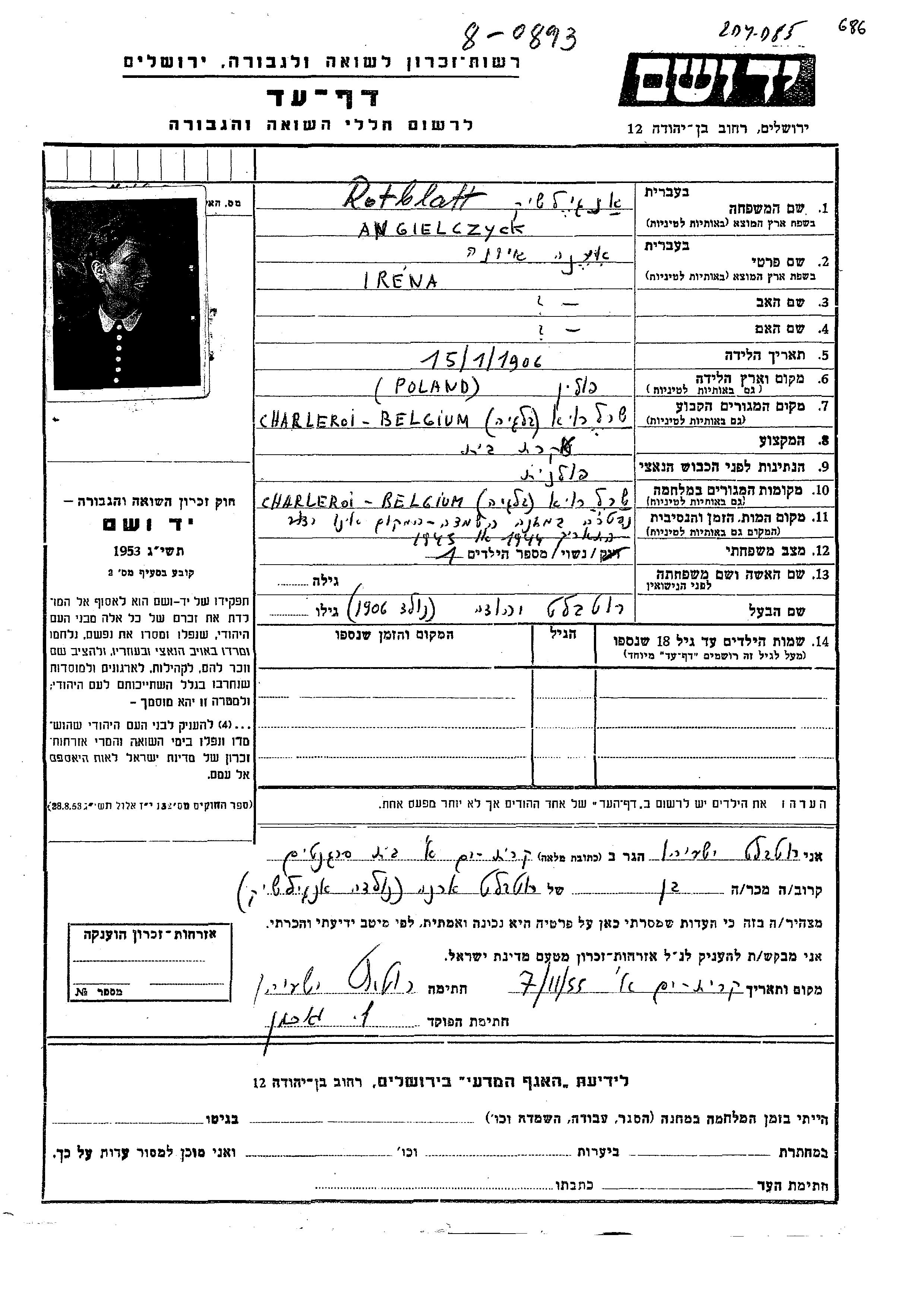 Irena Erna Rotblatt, geb. Angielczyck wurde im Jahr 1906 in Polen geboren. Sie war Hausfrau. Vor dem Zweiten Weltkrieg lebte sie in Charleroi, Belgien.