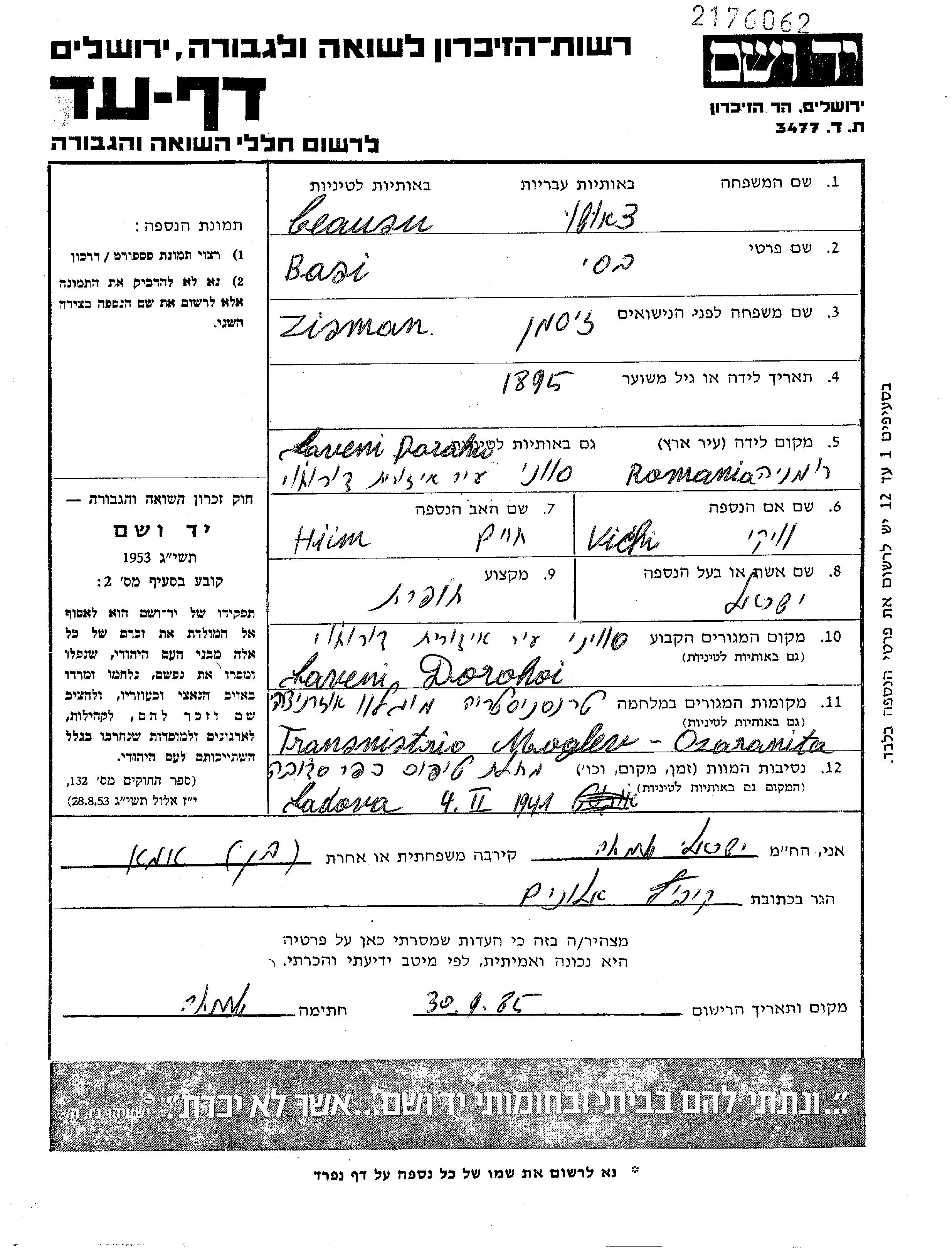 Basi Ceausu, geb. Zisman wurde im Jahr 1895 in Saveni, Rumänien geboren. Sie war Schneiderin. Vor dem Zweiten Weltkrieg lebte sie in Saveni, Rumänien.