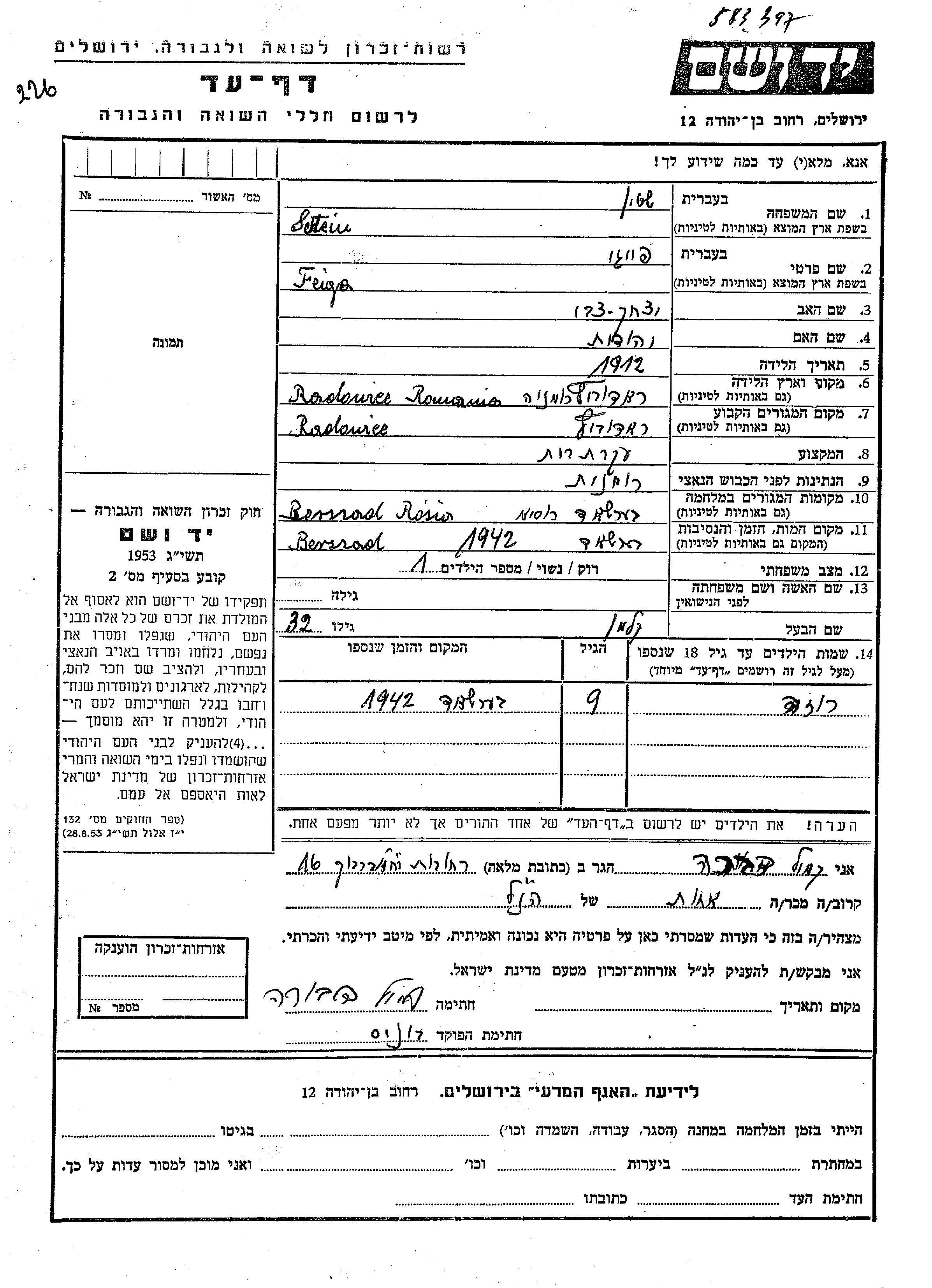 Feiga Schtein, geb. Hornshtein wurde in Radauti, Rumänien geboren. Sie war Hausfrau. Vor dem Zweiten Weltkrieg lebte sie in Radauti, Rumänien.