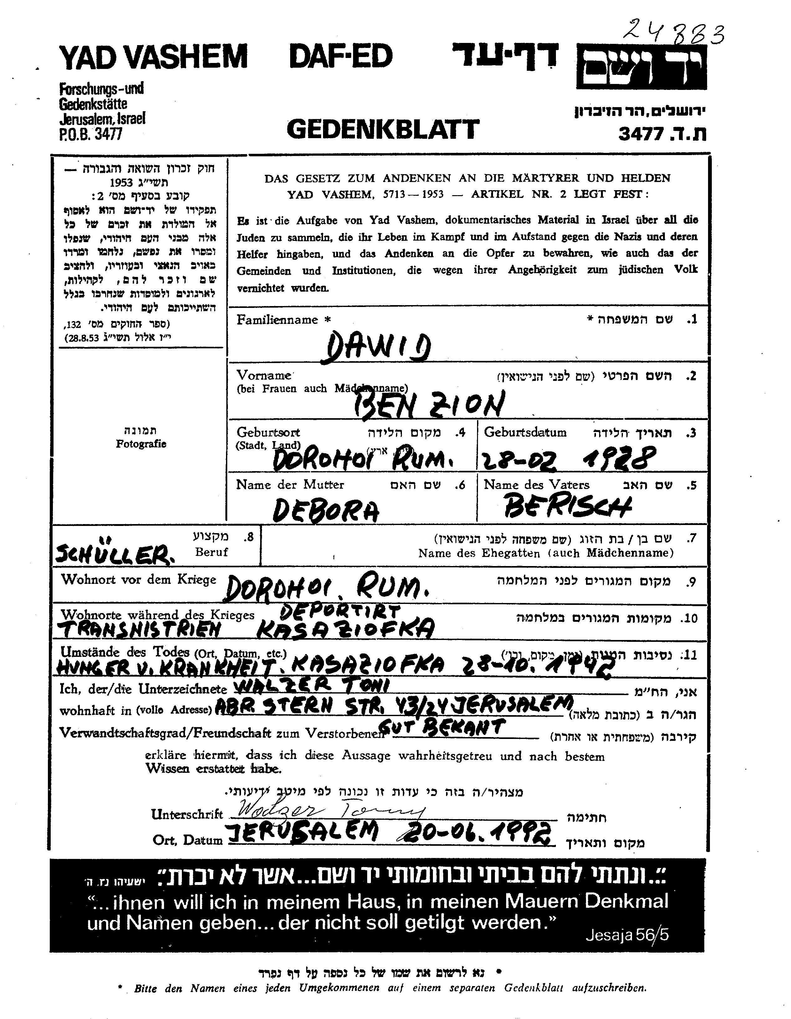 Dawid | Benzion Tzion | 1928 | Dorohoi, Rumänien | Gedenkblatt |