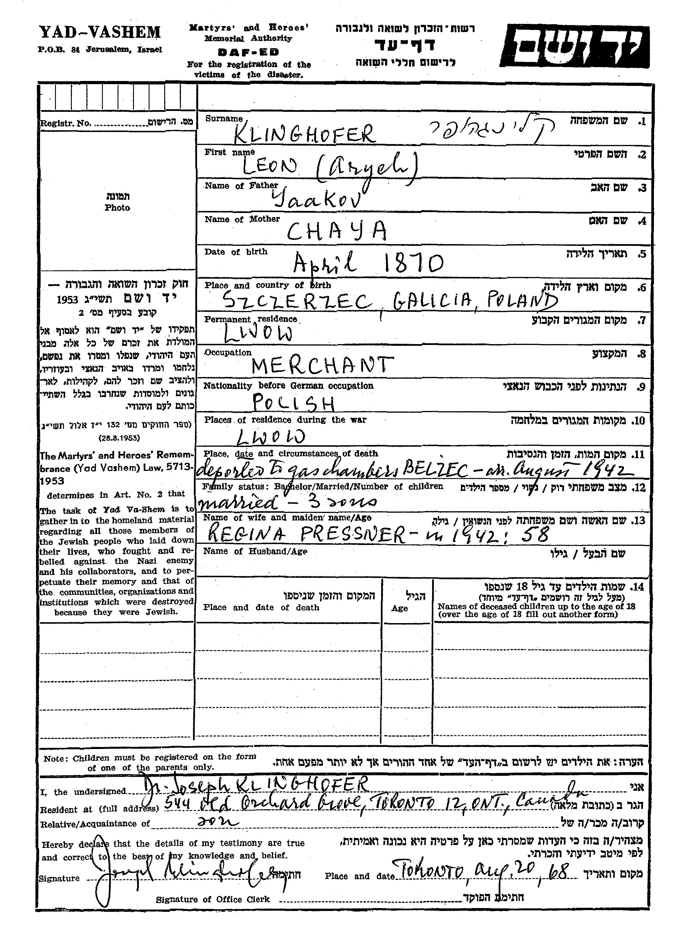 Arie Leon Klinghofer wurde in Szczerzec, Polen geboren. Vor dem Zweiten Weltkrieg lebte er in Lwow, Polen.