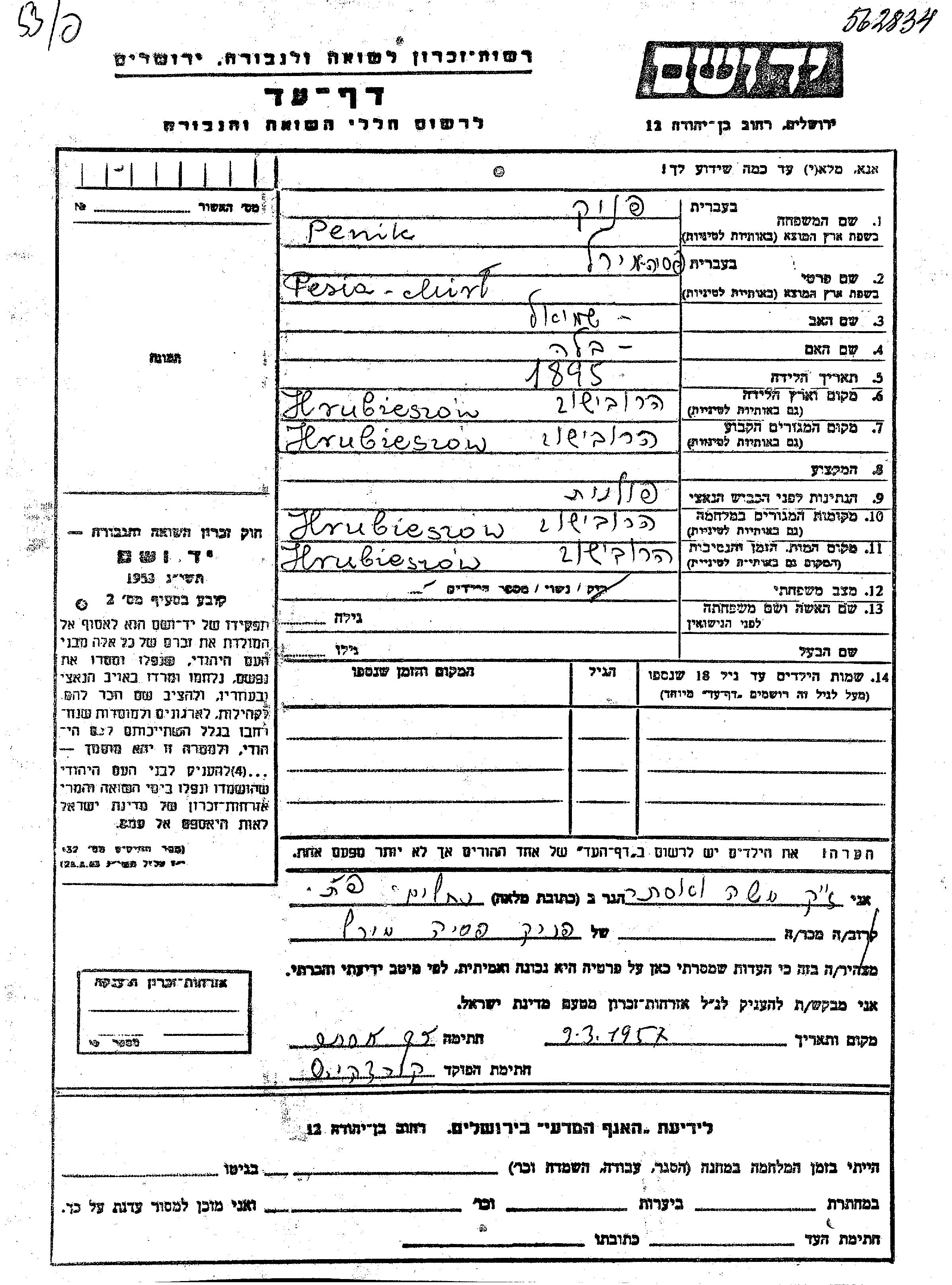 Pesia Mirl Fenik Penik Torba, geb. Penik wurde in Hrubieszow, Polen geboren. Sie war Hausfrau. Vor dem Zweiten Weltkrieg lebte sie in Hrubieszow, Polen.