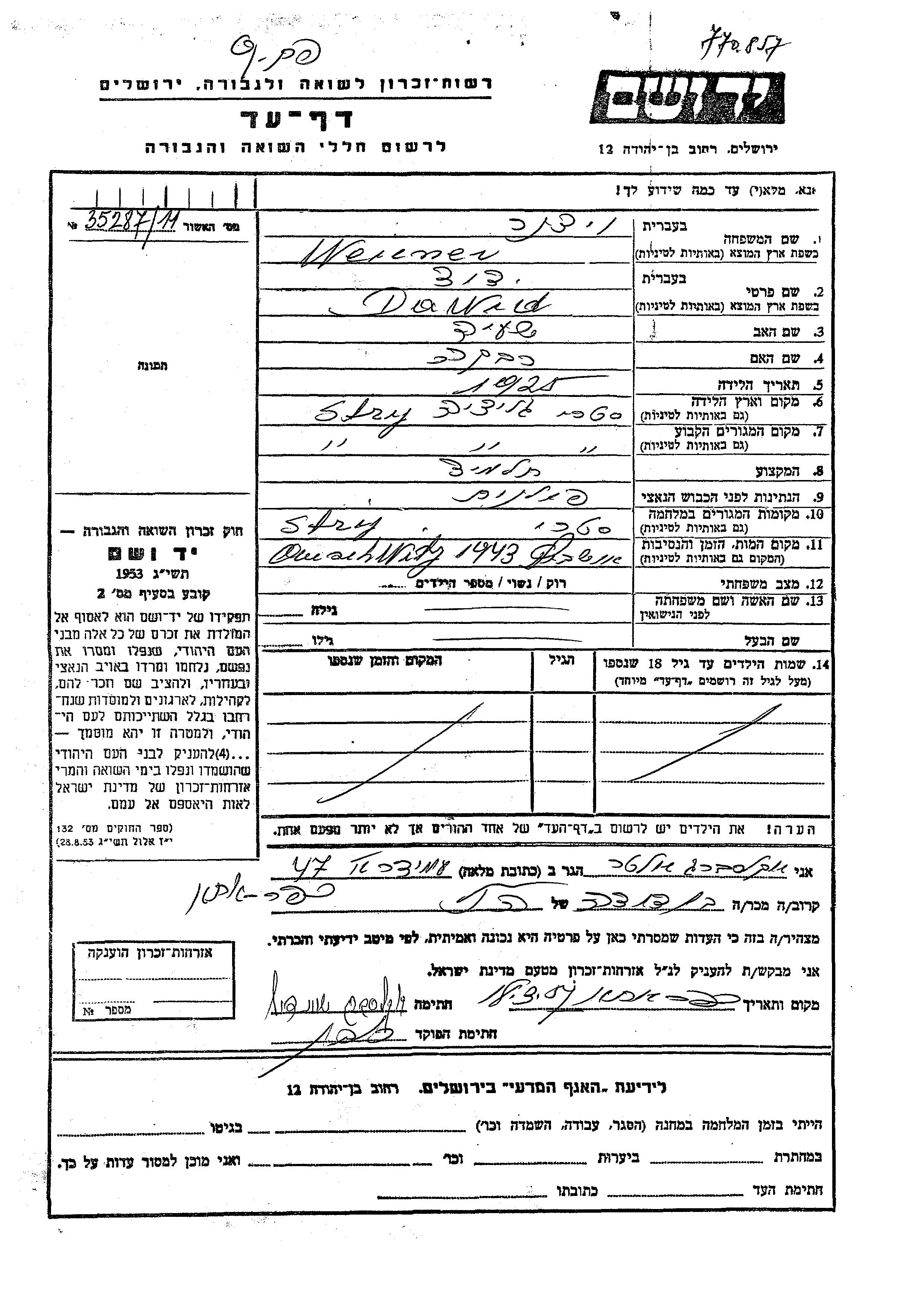 David Weicner wurde im Jahr 1925 in Stryj, Polen geboren. Er war Schüler/-in. Vor dem Zweiten Weltkrieg lebte er in Stryj, Polen.