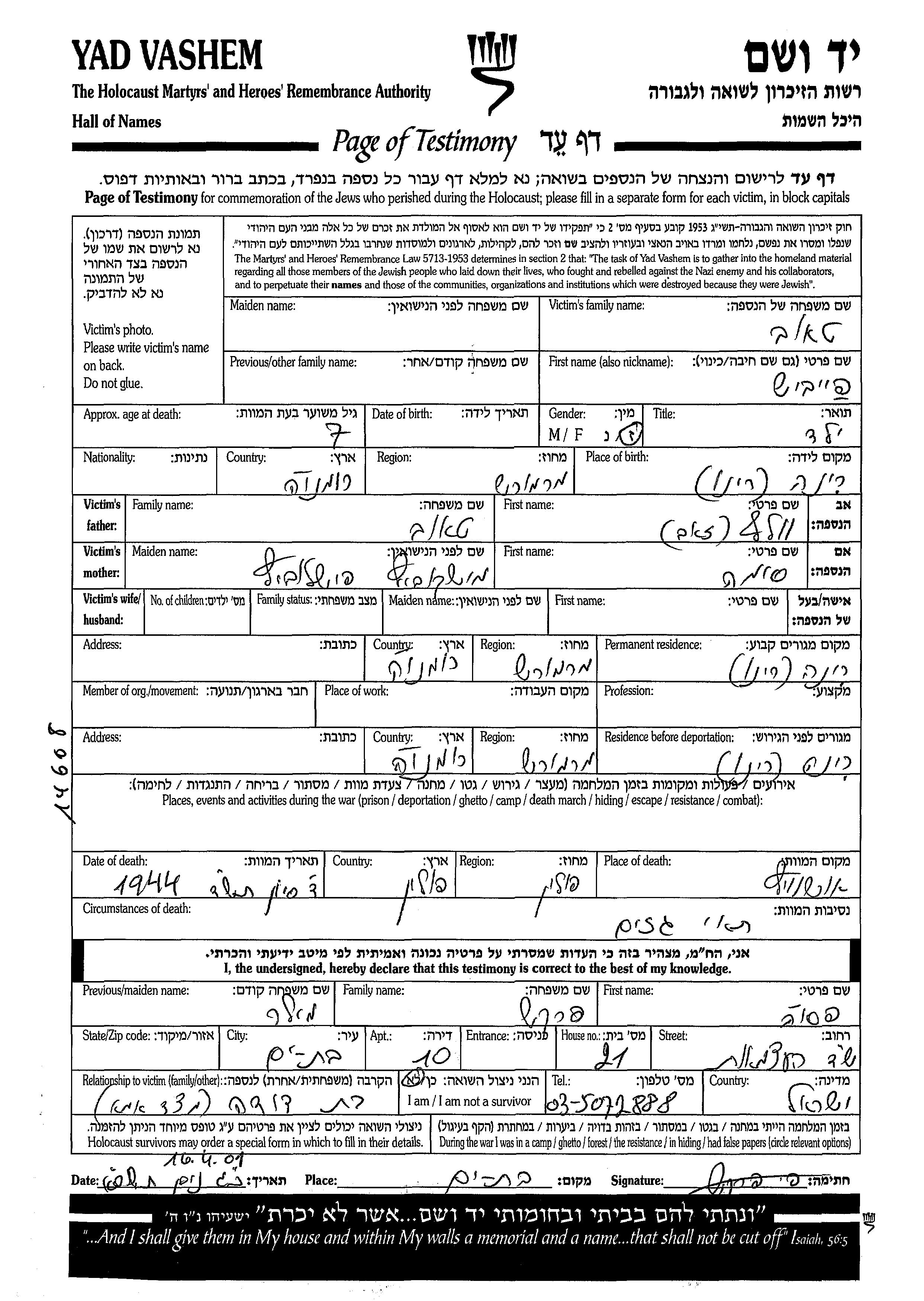Feibish wurde in der Schoah ermordet. Todesort: Auschwitz, Polen im Jahr 1944.
