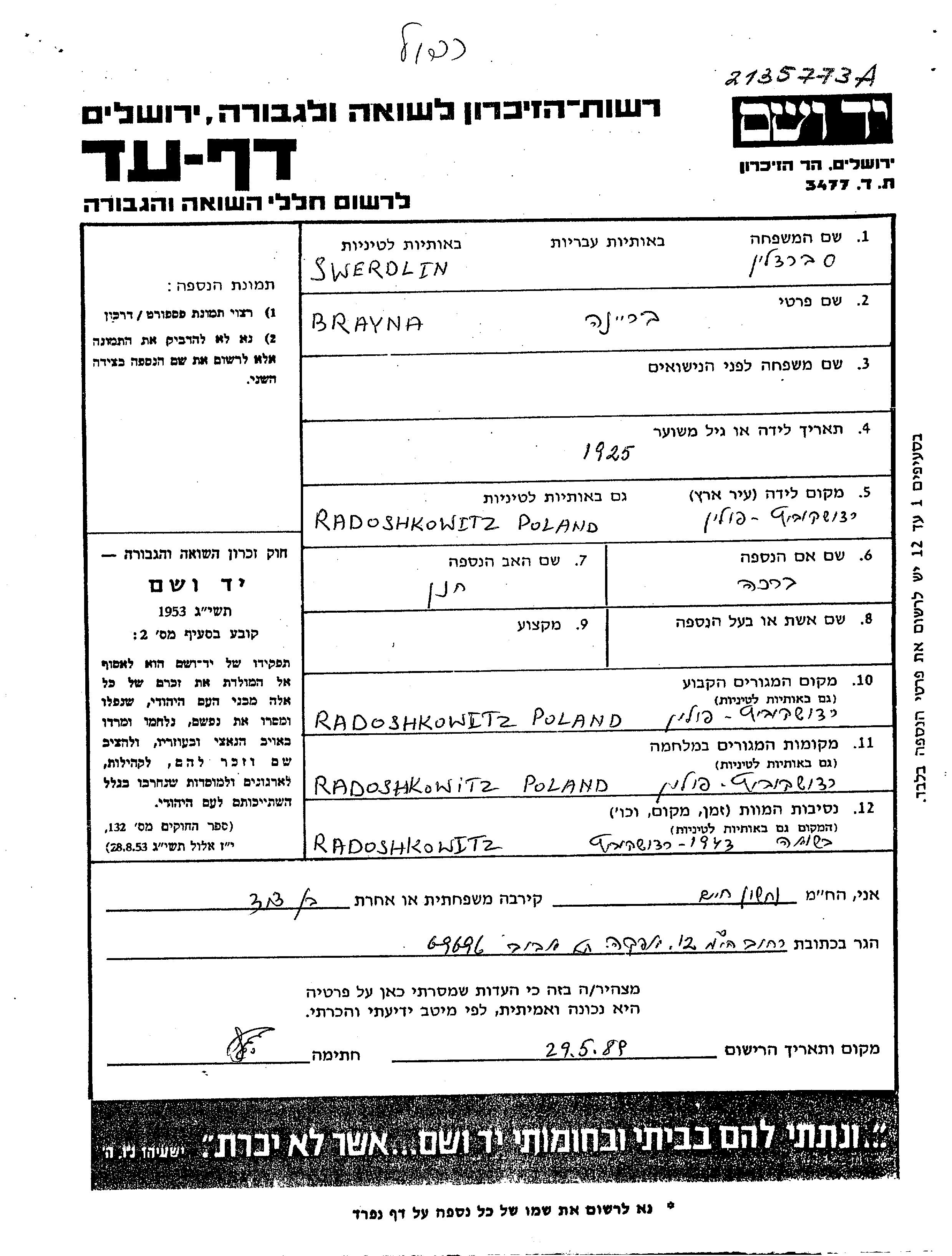 Breina Swerdlin wurde im Jahr 1925 in Radoszkowice, Polen geboren. Sie war Schüler/-in. Vor dem Zweiten Weltkrieg lebte sie in Radoszkowice, Polen.